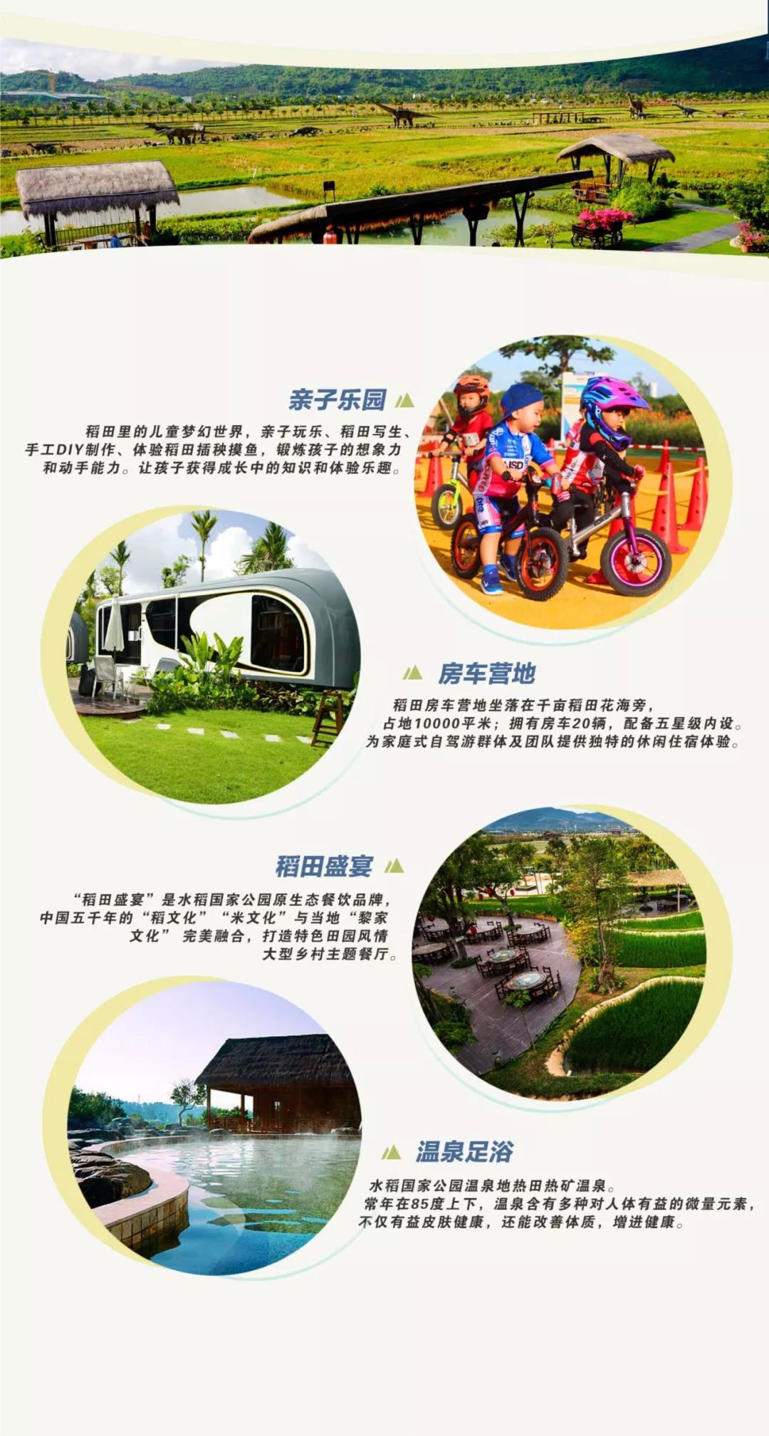 三亚水稻国家公园推出了千亩稻田花海,国家南繁科研育种基地,全球首个中国恐龙科普教育基地,田野狂欢大型山水实景演出,稻田盛宴大型餐饮系统,海棠稻乡共享农庄线下展销体验基地,科学奇幻亲子乐园,稻田温泉景观区,房车体验中心,稻田盛宴海鲜广场,禾下乘凉游客中心,稻田艺术画等,以差异化农旅融合创新产品丰富了海南旅游业态,成为了“把博物馆搬到大地,把科普融入田间”的科普旅游示范区、“南繁硅谷”的集中展示区、农耕文化体验区、研学旅游示范基地。三亚水稻国家公园还将建设水稻博物馆、稻田温泉养生体验系统,推出更多农事体验活动、农耕文化旅游节庆活动……构成吃、住、行、游、购、娱;商、养、学、闲、情、奇的旅游生态链,以新资源,新理念,新产品,新体验打造全新的农旅融合品牌景区。