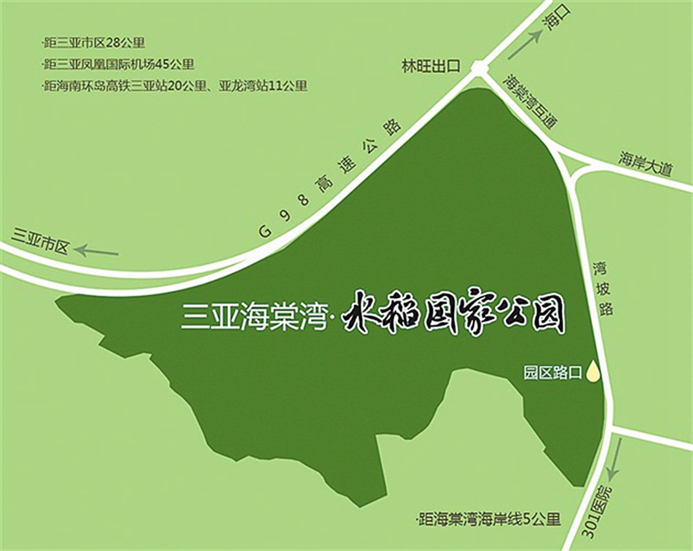 三亚水稻国家公园是三亚最大的农旅融合国家4A级旅游景区,中国(三亚)国际水稻论坛永久会址 ,位于三亚市东北部海棠湾海岸南部入口,地处北纬18度,拥有优质的农业生态资源。景区距离三亚市区28公里,距三亚凤凰国际机场45公里,距海南环岛高铁三亚站20公里、距亚龙湾站11公里、具有卓越的区位、交通优势,属三亚半小时经济圈。