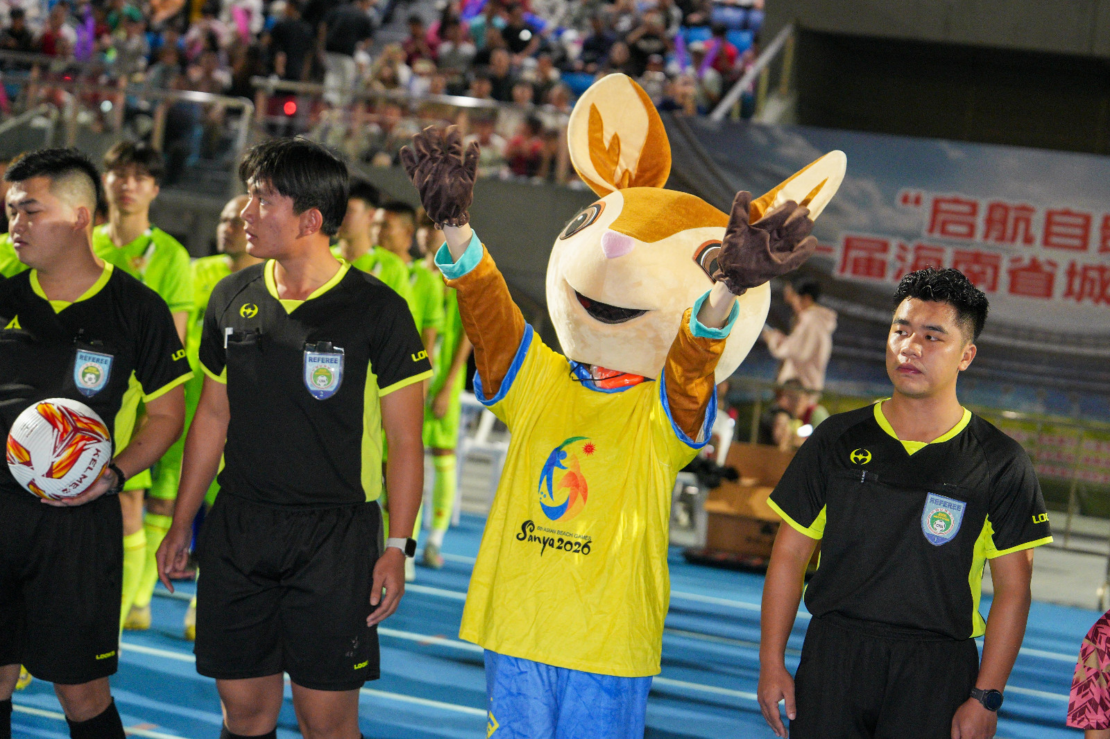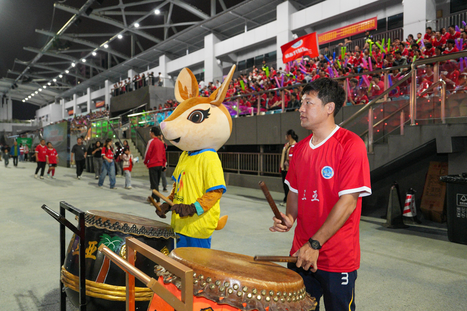 在三亚赛区,黎族特色舞蹈和动感嘻哈歌曲热场后,三亚亚沙会吉祥物“亚亚”携手主场作战的三亚队和陵水队两队运动员上场。在绿茵场上,活力四射的“亚亚”的出现,瞬间点燃了全场的热情。它不仅抡起鼓槌为运动健儿们击鼓助威,更是热情地挥舞双臂与看台上的球迷朋友们亲密互动,大方地与兴奋的观众合影留念,成为全场瞩目的焦点,看台上欢呼声、笑声与掌声汇成一片,将现场气氛推向又一个高潮。