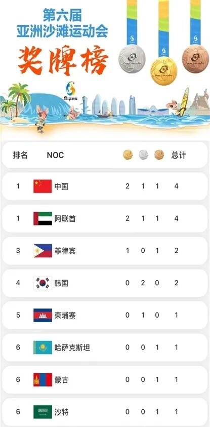 第六届亚洲沙滩运动会奖牌榜出炉!截至4月23日,中国代表队与阿联酋代表队皆获得2枚金牌、1枚银牌和1枚铜牌,暂时并列第一,紧随其后的是获得1枚金牌和1枚铜牌的菲律宾代表队。