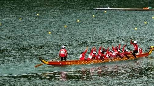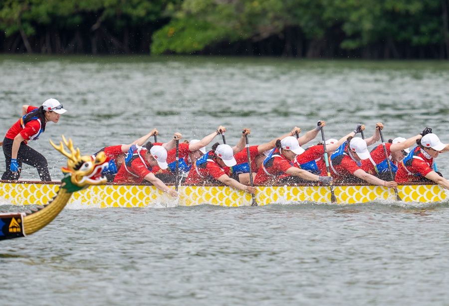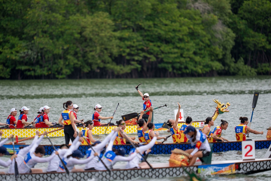 现场,中国女子龙舟队全队鼓点铿锵、划桨齐整、全力冲刺,最终率先冲线,夺得金牌,越南队、泰国队分获亚军、季军。