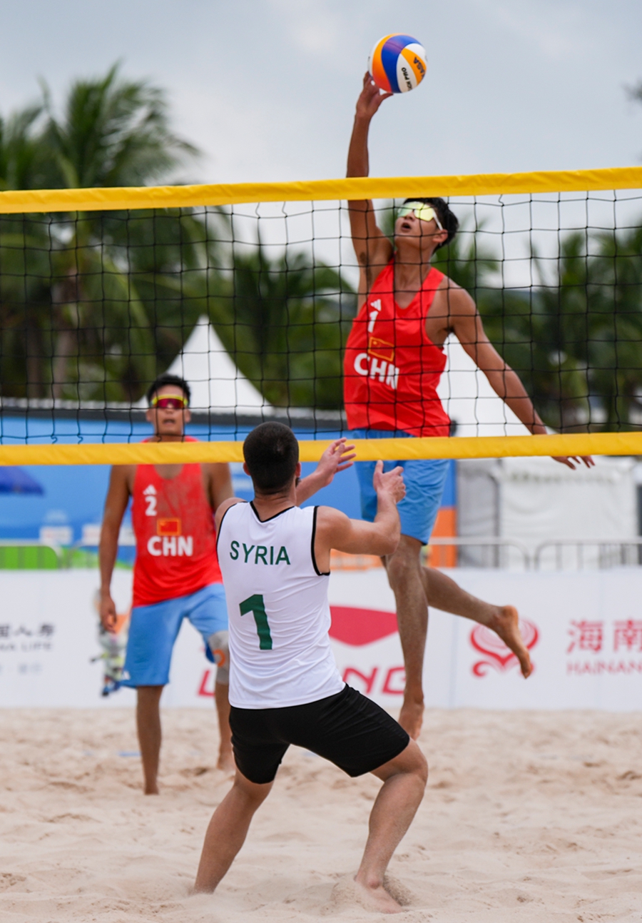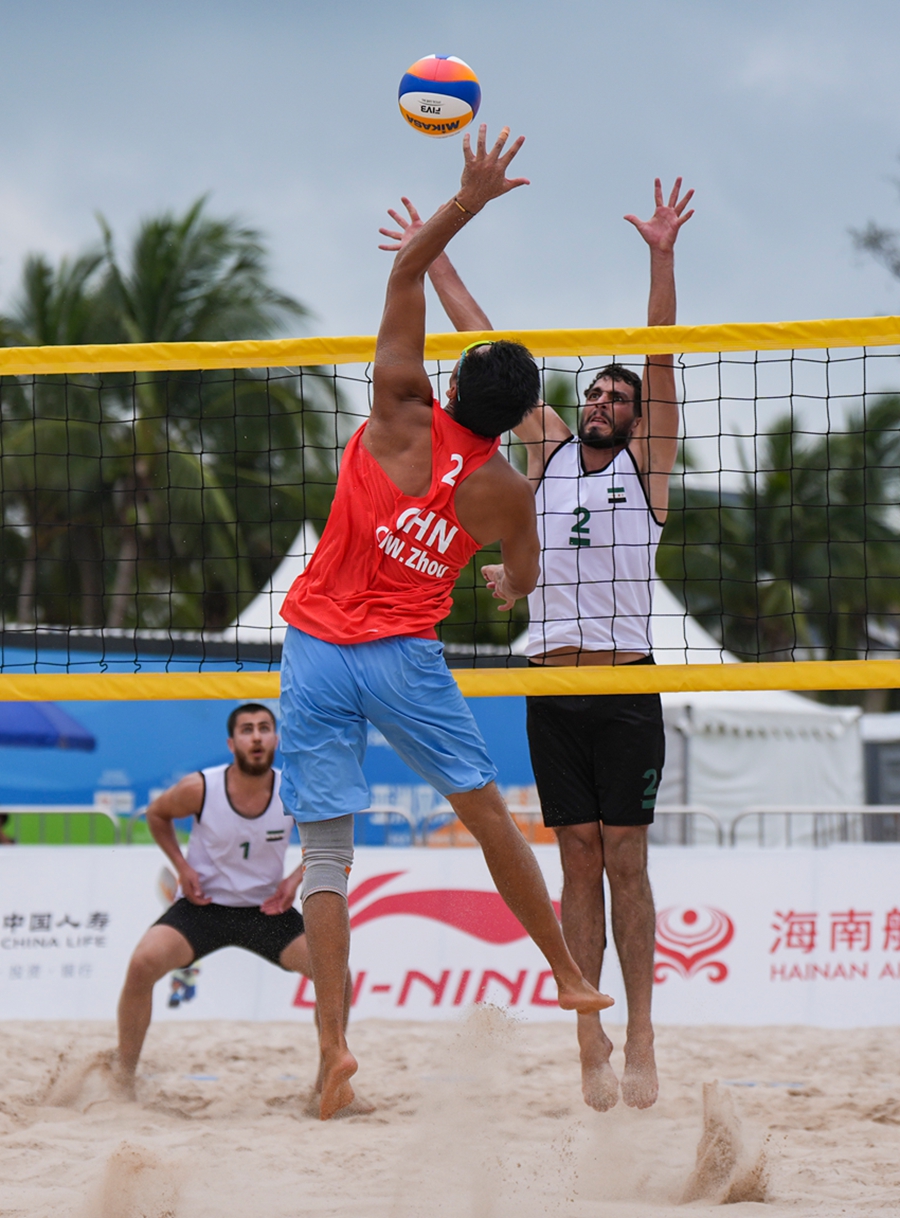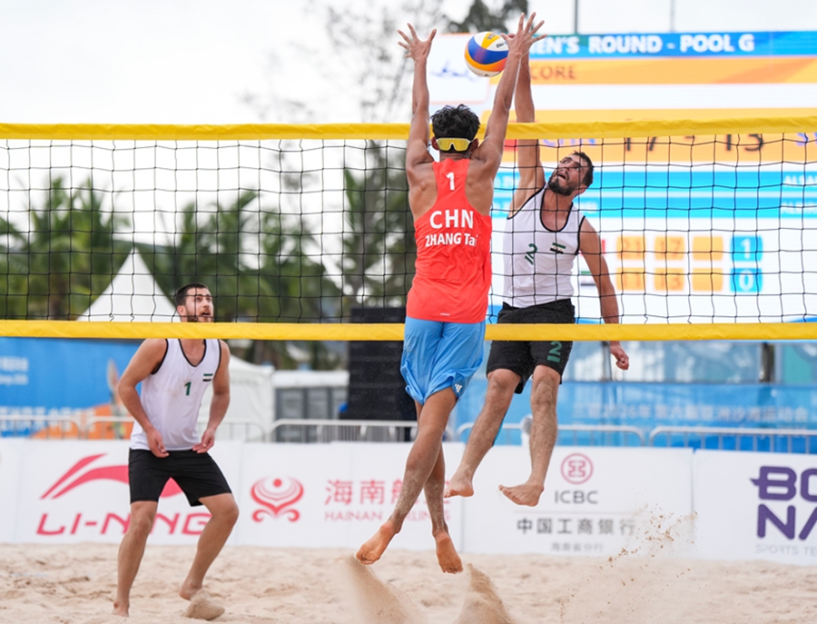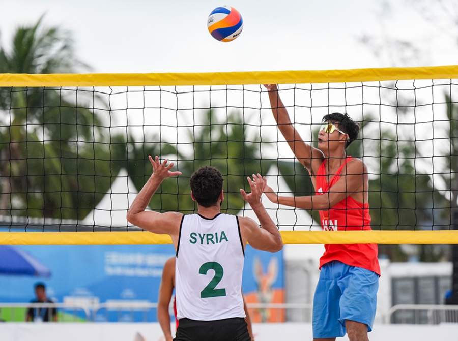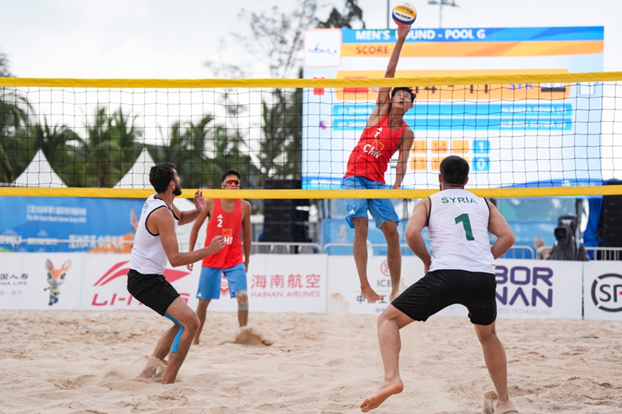 4月24日,在海南三亚举行的第六届亚洲沙滩运动会沙滩排球男子小组赛赛场热浪升腾,G组小组赛中,中国组合张泰/周朝威以2-0的比分干净利落地击败叙利亚组合奥尔瓦·阿尔萨卡/库提巴·阿尔比里尼,拿下比赛胜利。