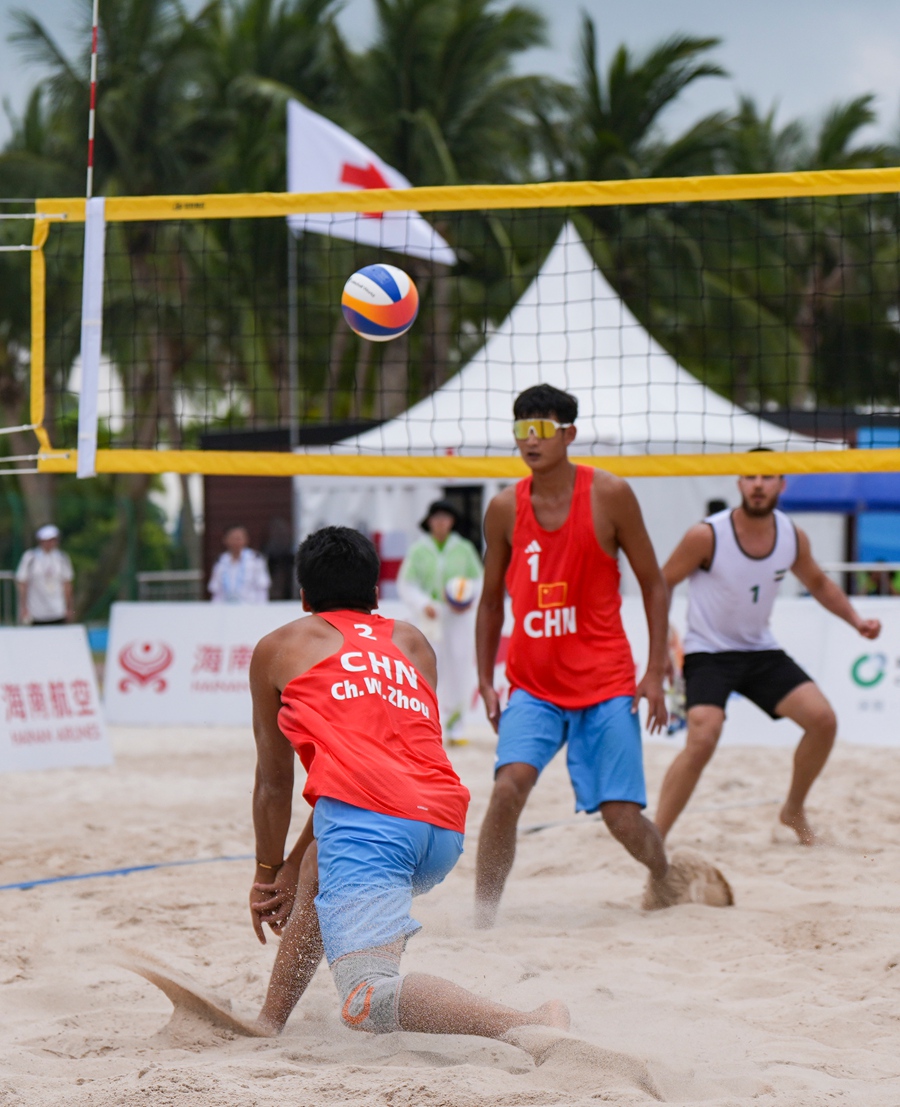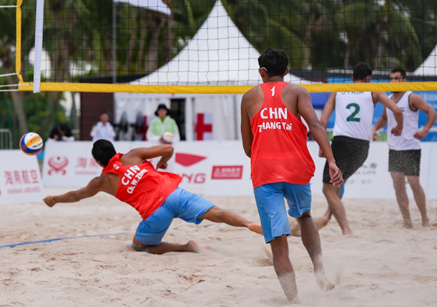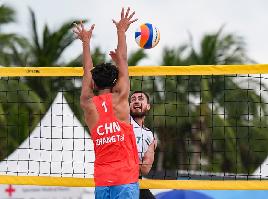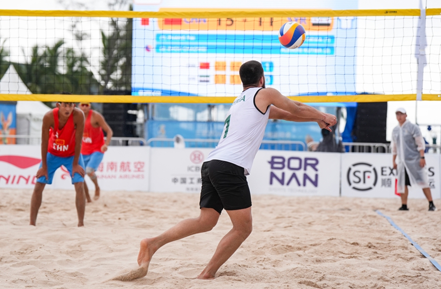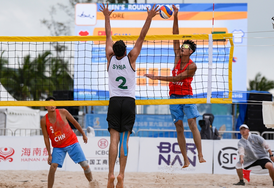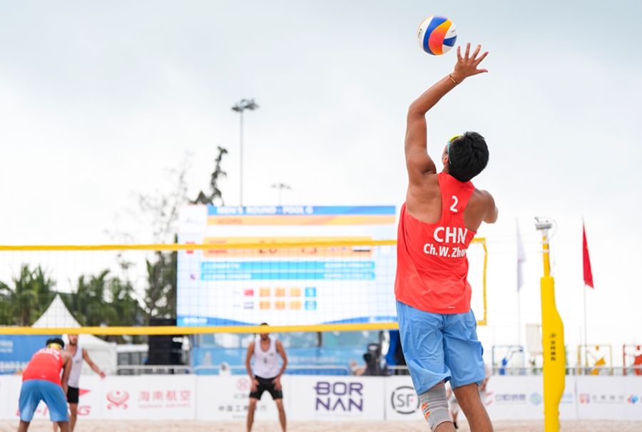 4月24日,在海南三亚举行的第六届亚洲沙滩运动会沙滩排球男子小组赛赛场热浪升腾,G组小组赛中,中国组合张泰/周朝威以2-0的比分干净利落地击败叙利亚组合奥尔瓦·阿尔萨卡/库提巴·阿尔比里尼,拿下比赛胜利。