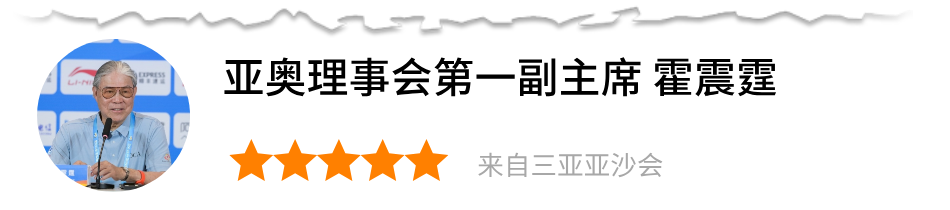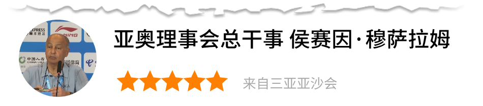 三亚真是一个旅游天堂!你能感受到三亚的氛围,每个人都非常开心、友好。我很喜欢这里的自然环境——绿意盎然,空气清新,海水清澈,沙滩美丽。亚沙会是一扇美妙的窗口,让亚洲各国和地区更加了解美丽的三亚!三亚是开展运动的理想之地,不仅整体环境非常适合户外运动,同时还拥有众多优质的室内体育设施。期待未来与中国奥委会、国家体育总局携手合作,争取推动更多国际赛事落地三亚。