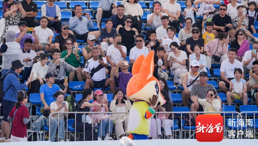 比赛间隙,三亚亚沙会吉祥物“亚亚”与现场市民游客互动。海报集团全媒体记者 李昊 摄