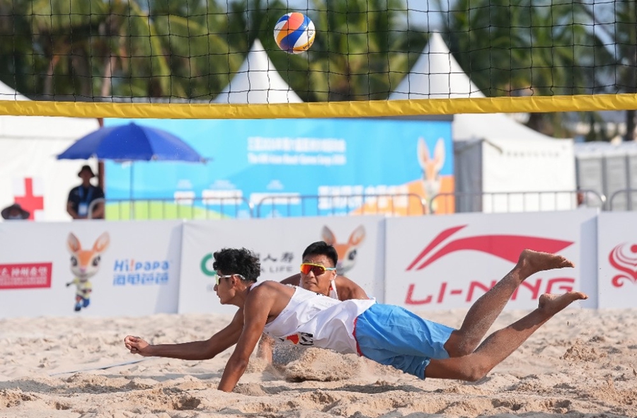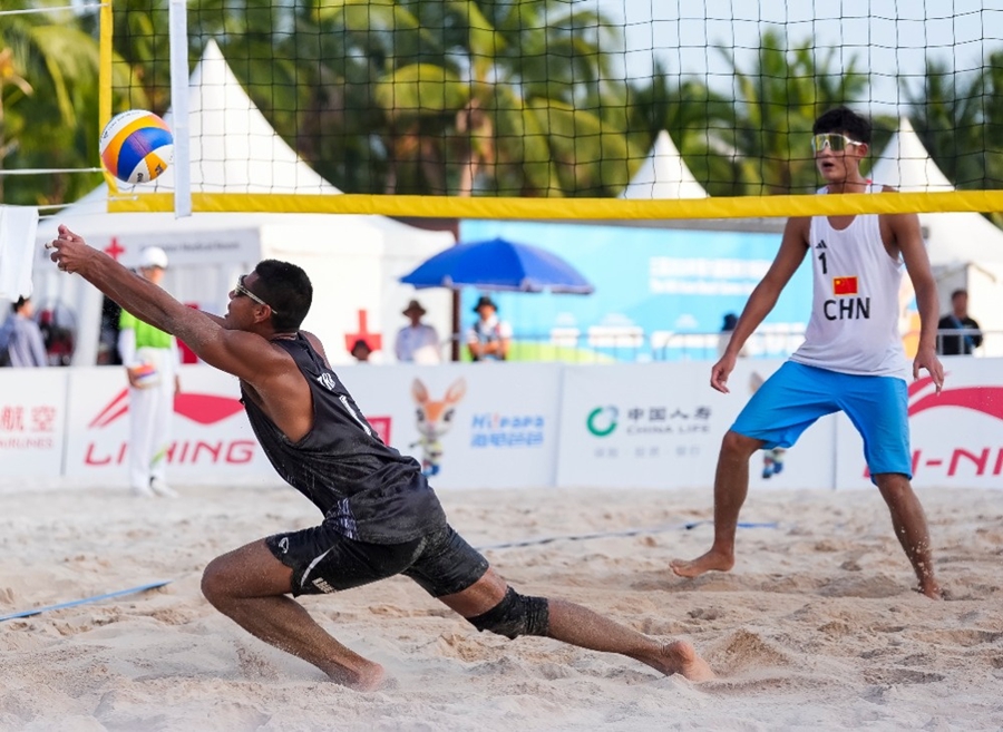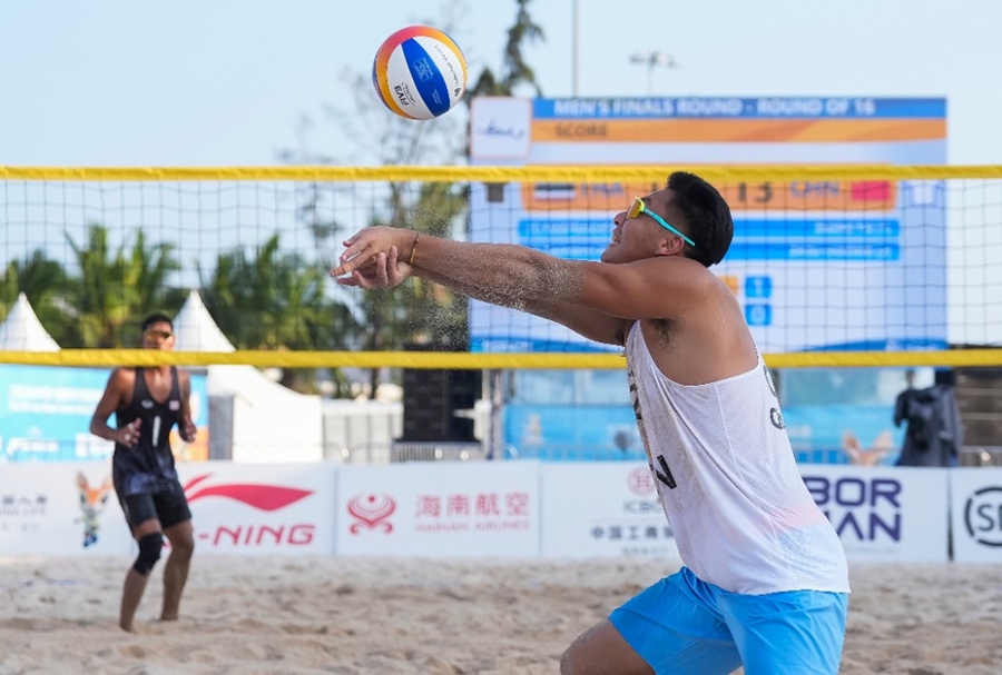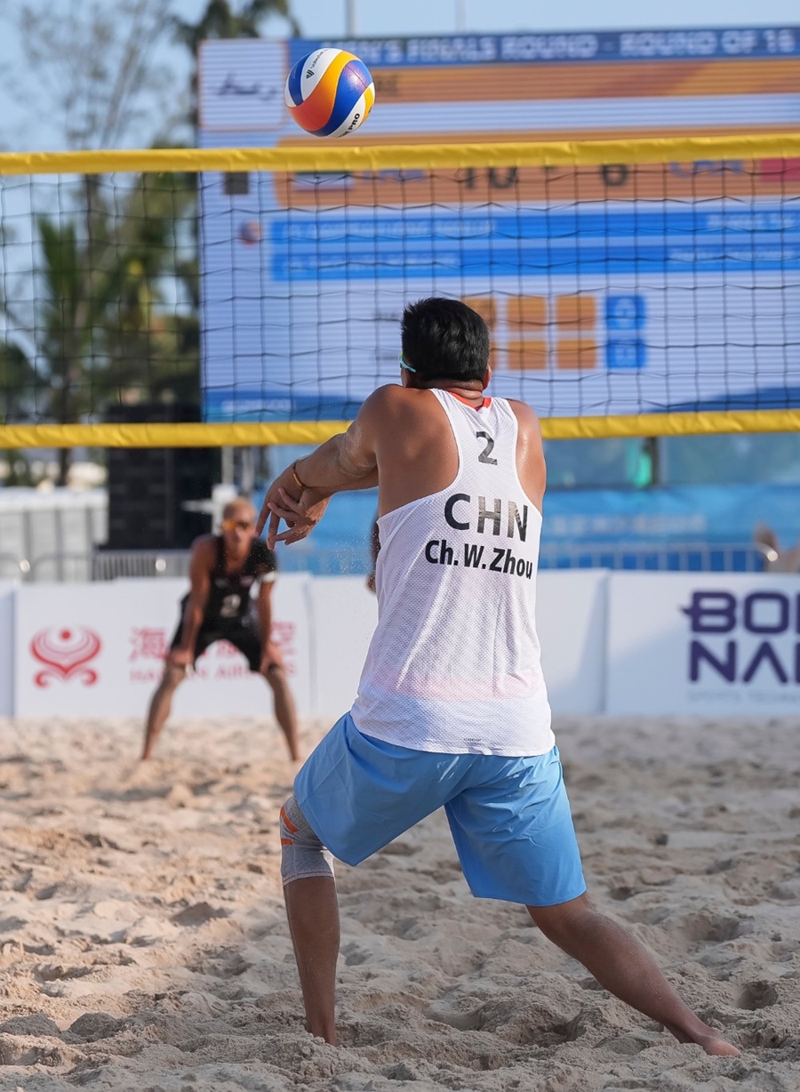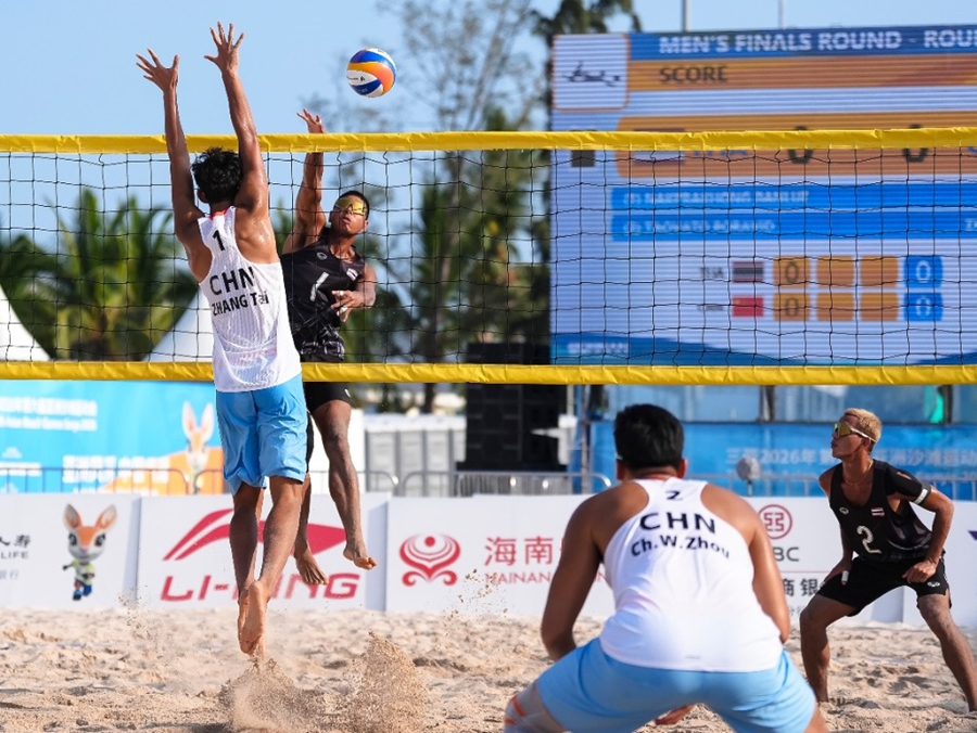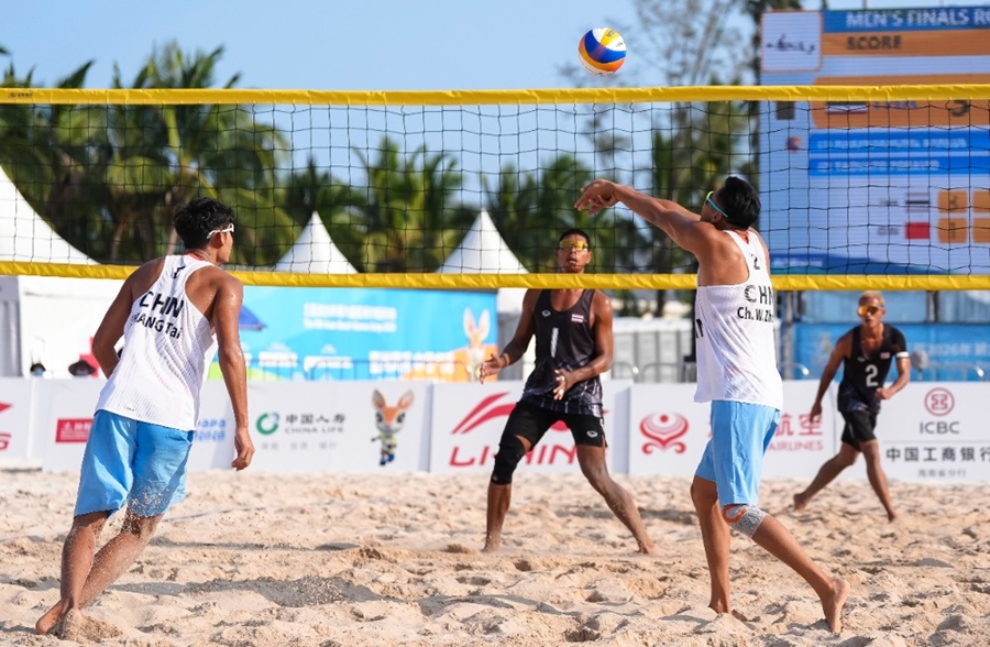 4月26日,在海南三亚举行的第六届亚洲沙滩运动会沙滩排球男子16强淘汰赛中,中国组合张泰/周朝威2:1战胜泰国组合班鲁・纳巴空/波拉维・陶瓦托。
