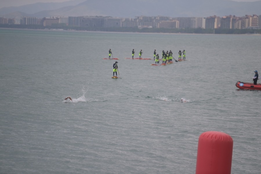 4月27日,第六届亚洲沙滩运动会公开水域游泳男女混合4×1.5公里接力赛举行。记者 沙晓峰 摄