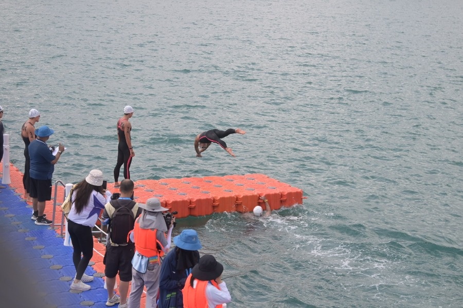 4月27日,第六届亚洲沙滩运动会公开水域游泳男女混合4×1.5公里接力赛举行。图为中国队运动员张子扬在接力中入水。记者 沙晓峰 摄