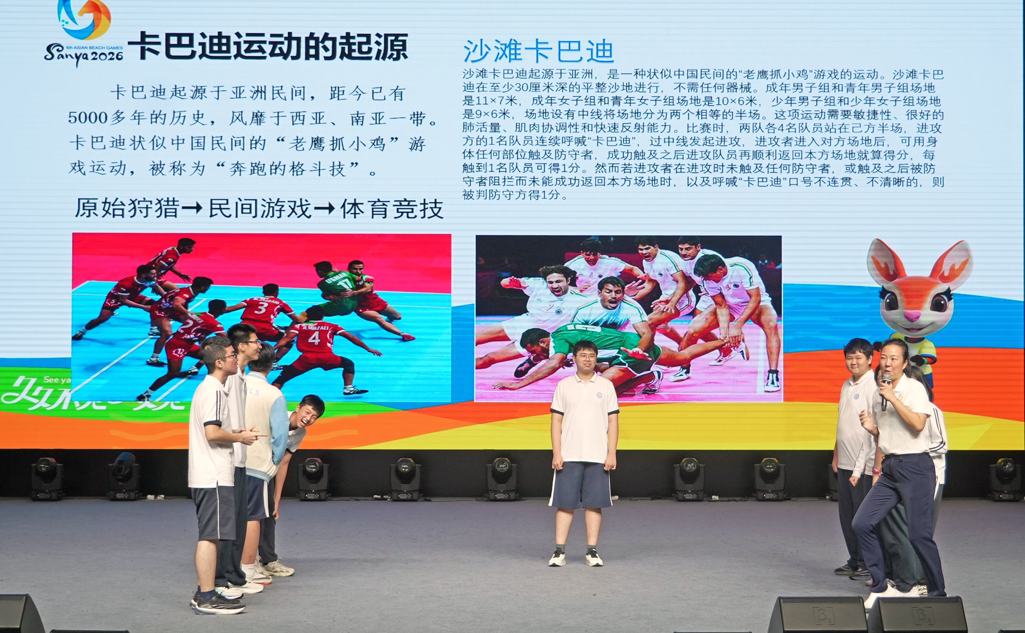 “沙滩卡巴迪起源于亚洲,是一种状似中国民间的‘老鹰抓小鸡’游戏的运动。”“帆船小项包括男女OP级别和ILCA4级别4个小项,十分考验选手的应变能力和心理素质。”“台克球的球桌弧度比乒乓球桌大一些”……问答环节更是将现场气氛推向高潮。问题一抛出,同学们纷纷高举起手,积极运用刚学到的知识作答,赢得了亚沙宣传礼品。整个礼堂洋溢着青春的朝气与求知的热情,大家在欢声笑语中解锁三亚亚沙会的独特魅力。
