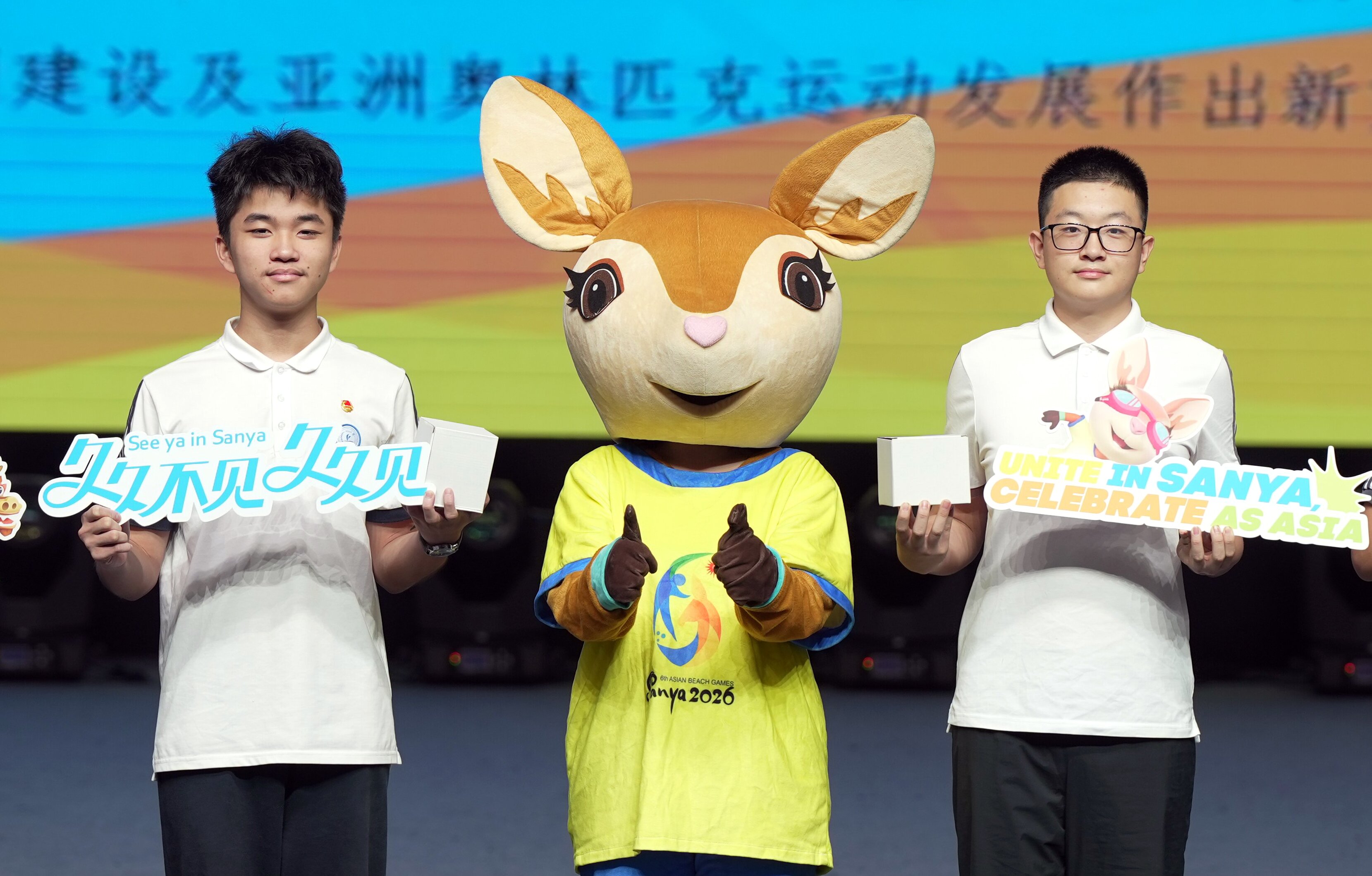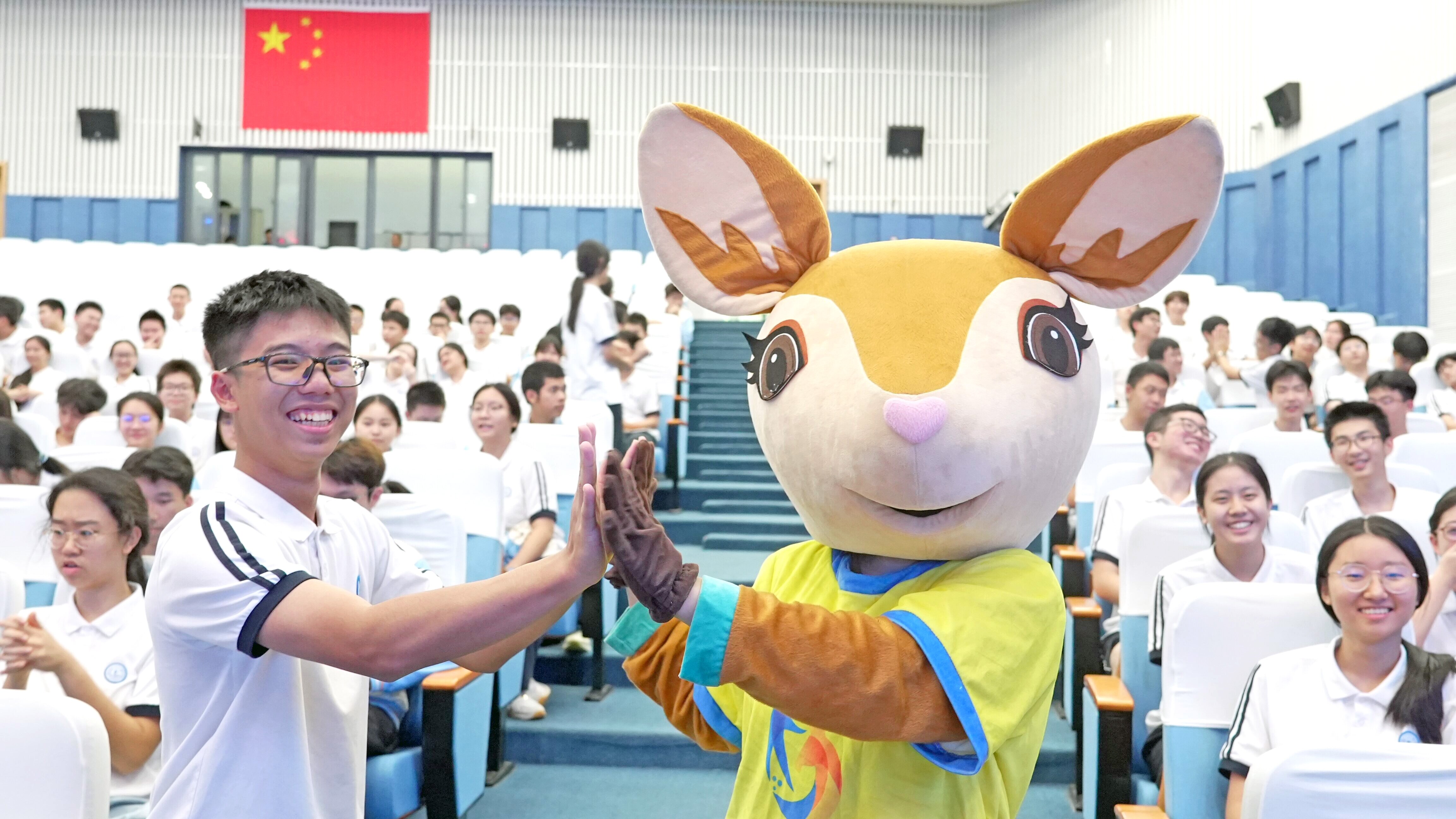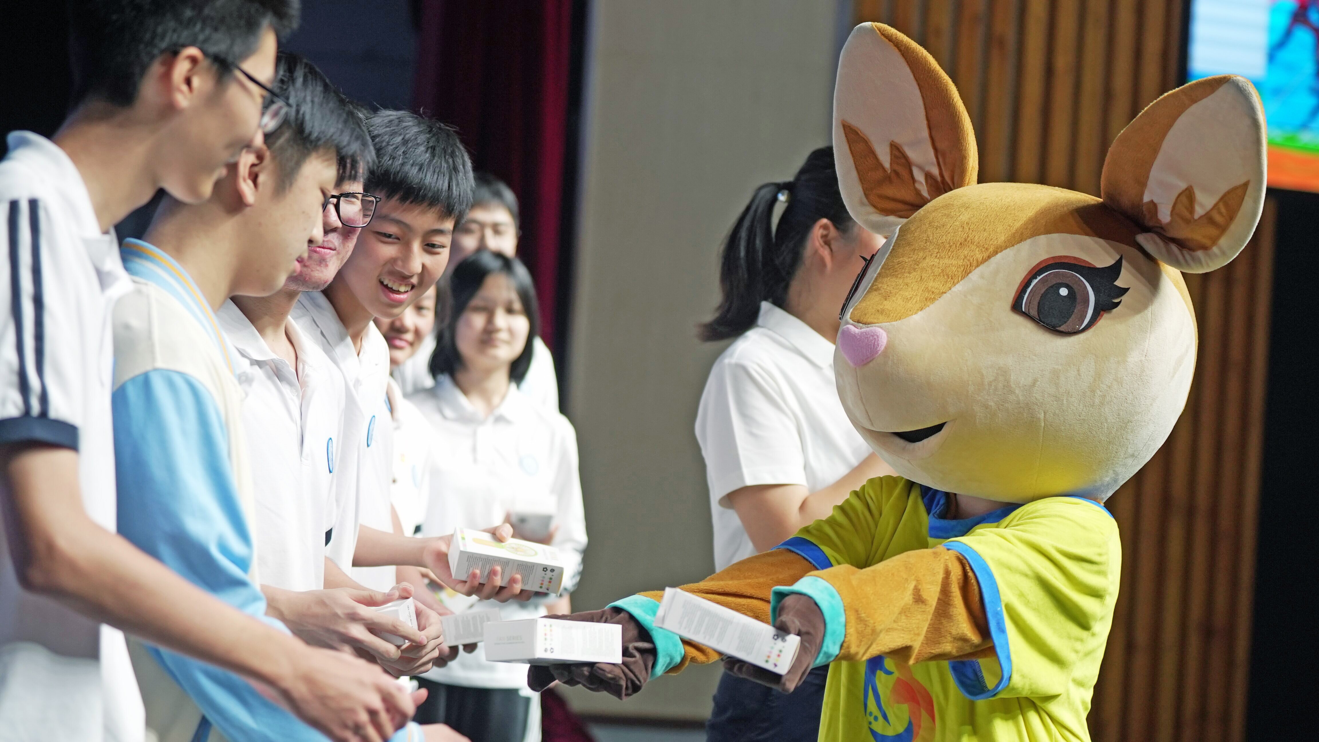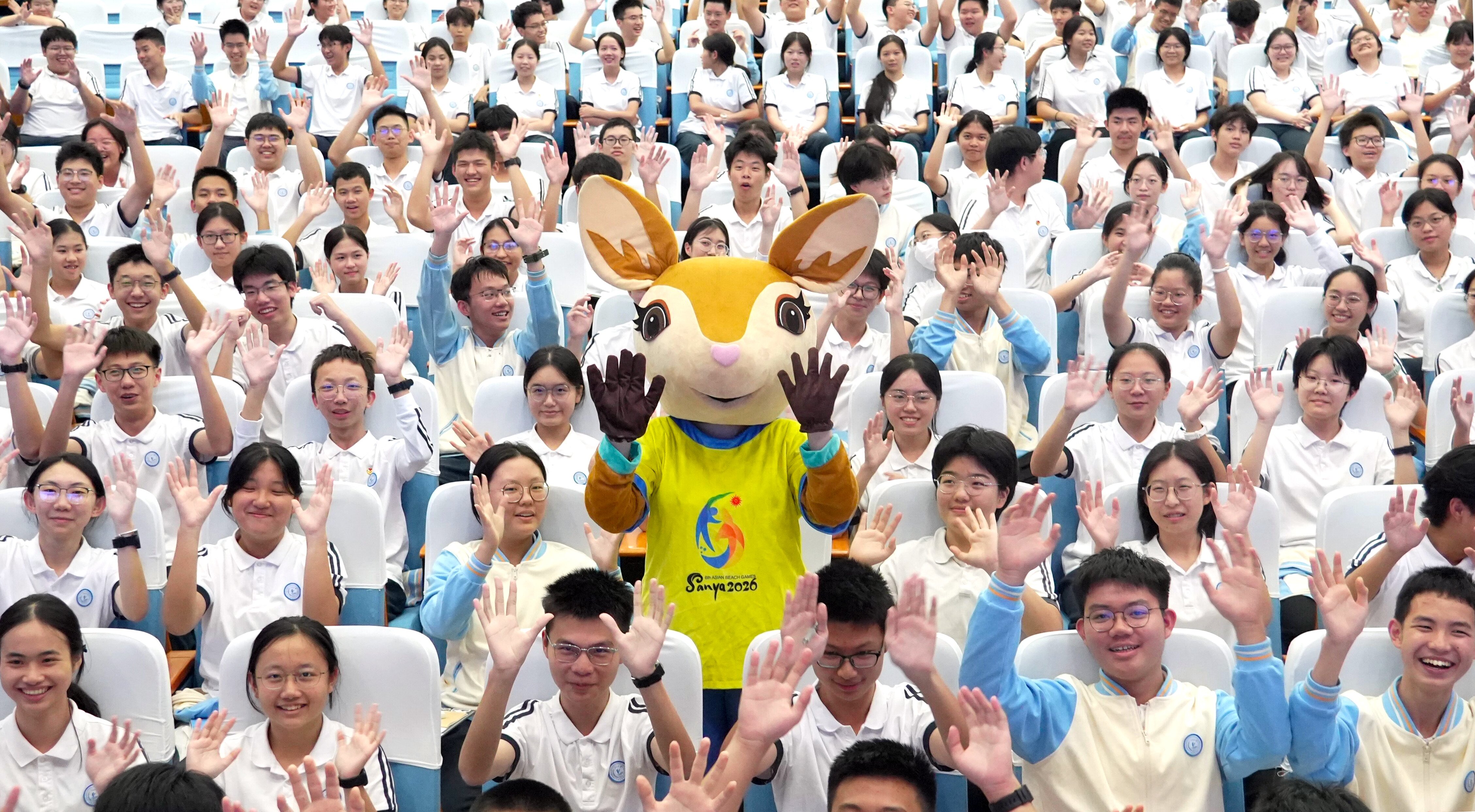 “哇,好可爱!”12月10日下午,上海外国语大学三亚附属中学的礼堂内,随着一阵惊喜的欢呼声响起,全场300余名学生的目光被吸引至台前。第六届亚洲沙滩运动会(以下简称:三亚亚沙会)吉祥物“亚亚”迈着憨态可掬的步伐登场,与前排学生击掌互动,瞬间点燃了整个会场的热情。这场充满活力的相遇,不仅拉近了三亚亚沙会与青少年的距离,也正式拉开了本次“亚沙知识课堂”的序幕。