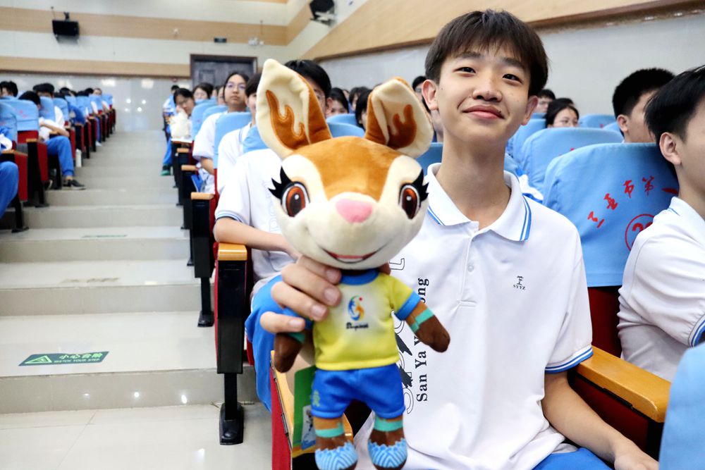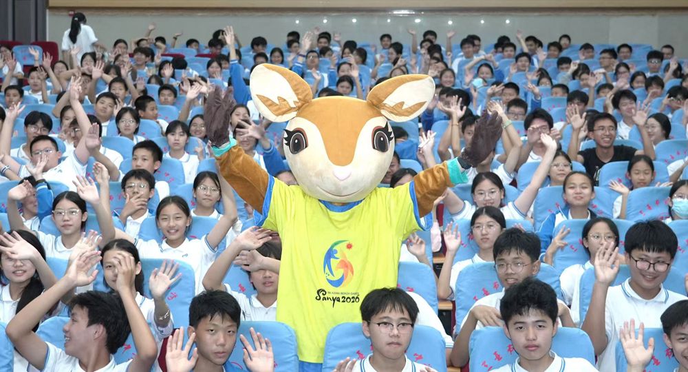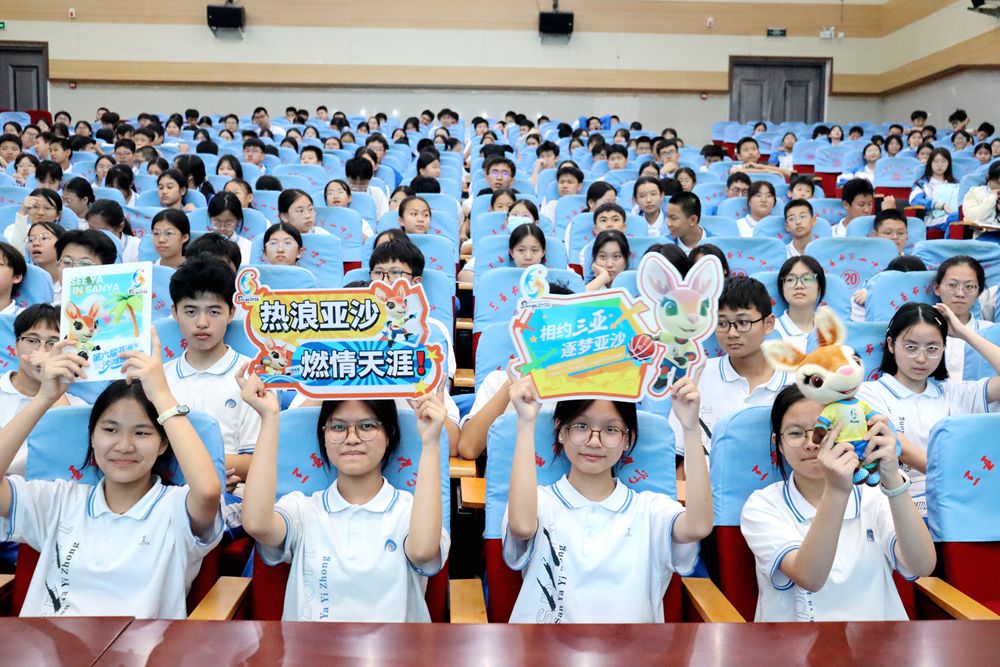 12月23日,第六届亚洲沙滩运动会(以下简称:三亚亚沙会)“亚沙知识课堂”走进三亚市第一中学,300余名学生齐聚一堂,与吉祥物“亚亚”欢乐同框,共同解锁三亚亚沙会的精彩知识。