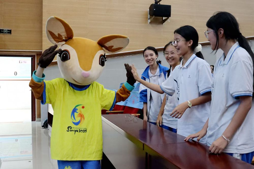 12月23日,第六届亚洲沙滩运动会“亚沙知识课堂”走进三亚市第一中学。三亚亚沙会吉祥物“亚亚”与学生们击掌互动。王昊 摄