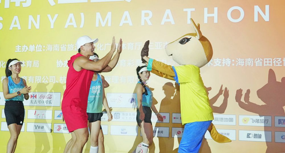 12月28日上午,2025年海南(三亚)马拉松激情开跑。第六届亚洲沙滩运动会吉祥物“亚亚”与刘畊宏在台上击掌互动。