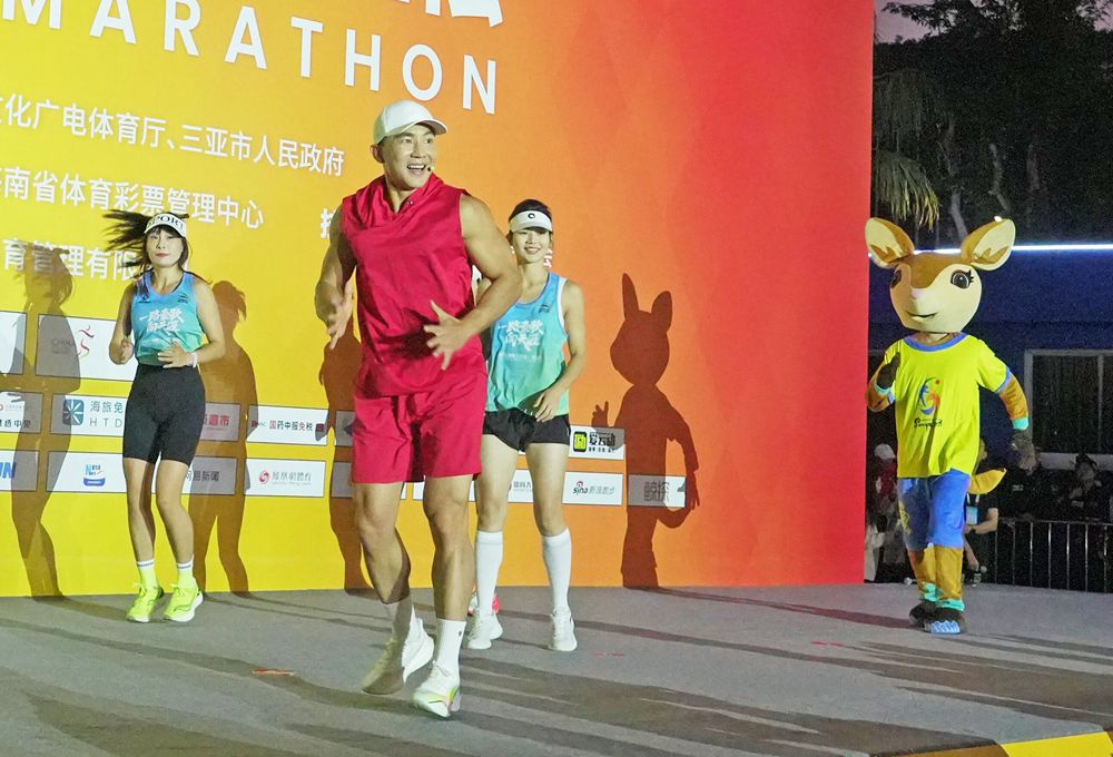 12月28日上午,2025年海南(三亚)马拉松激情开跑。第六届亚洲沙滩运动会吉祥物“亚亚”与刘畊宏一起跳热身操。