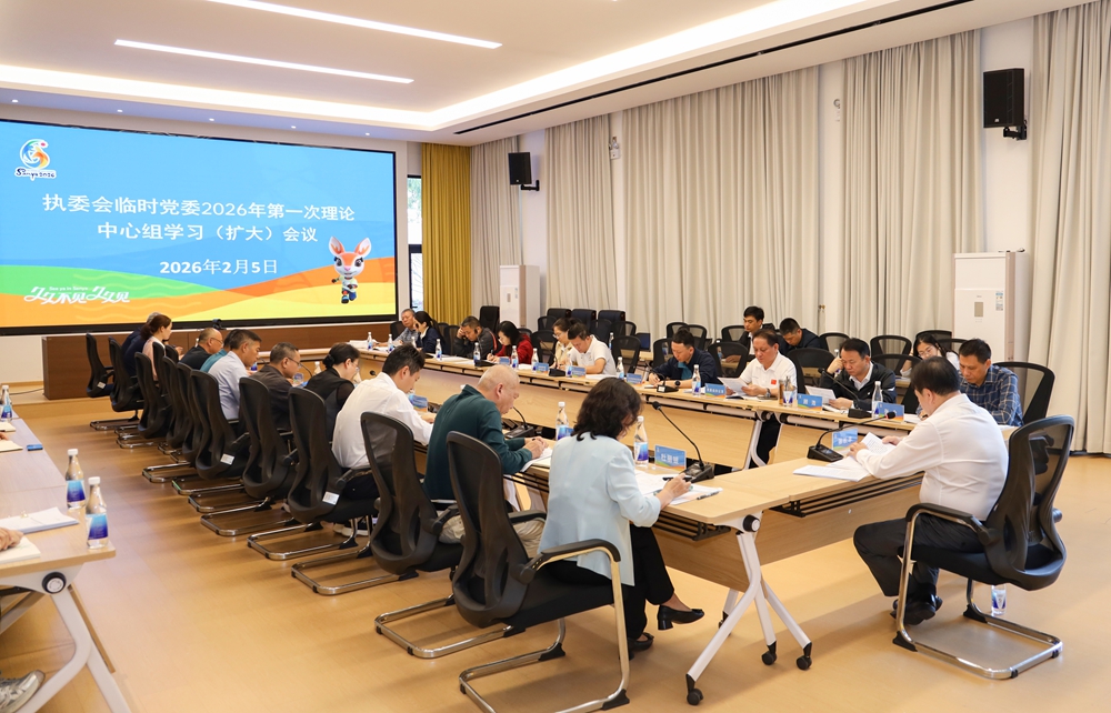 2月5日,第六届亚洲沙滩运动会(以下简称:三亚亚沙会)执行工作委员会临时党委组织召开2026年第一次理论中心组学习(扩大)会议。会议由临时党委书记张长丰主持,主要聚焦当前重要理论和决策部署,开展集中学习研讨,并对相关工作进行研究部署。