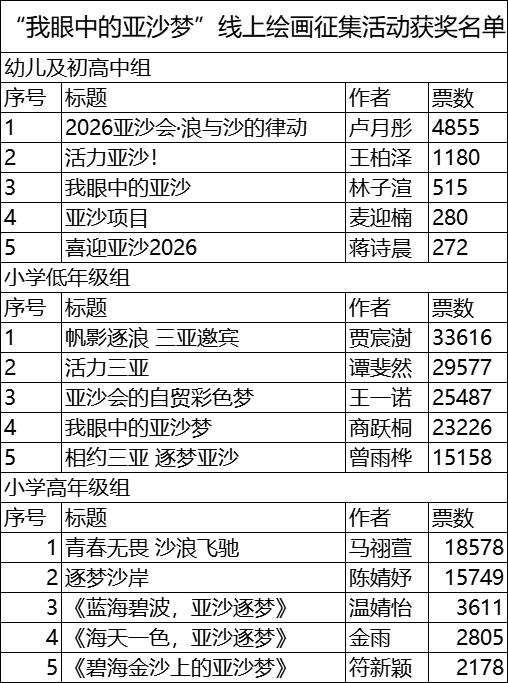本次活动于1月27日至2月7日晚上12时期间进行了线上投票。投票期间,每个IP或用户账号每日可投10票(不可重复投给同一作品)。目前投票环节已顺利结束,各项奖项均已评定完成。根据实际情况,评选按参赛者年龄段调整成三个组别:幼儿组(3-6岁)及初高中组、小学低年级组(一至三年级)、小学高年级组(四至六年级)。每组票数排名前五的作品荣获“网络人气奖”,获奖者将获得荣誉证书及三亚亚沙会纪念礼品。