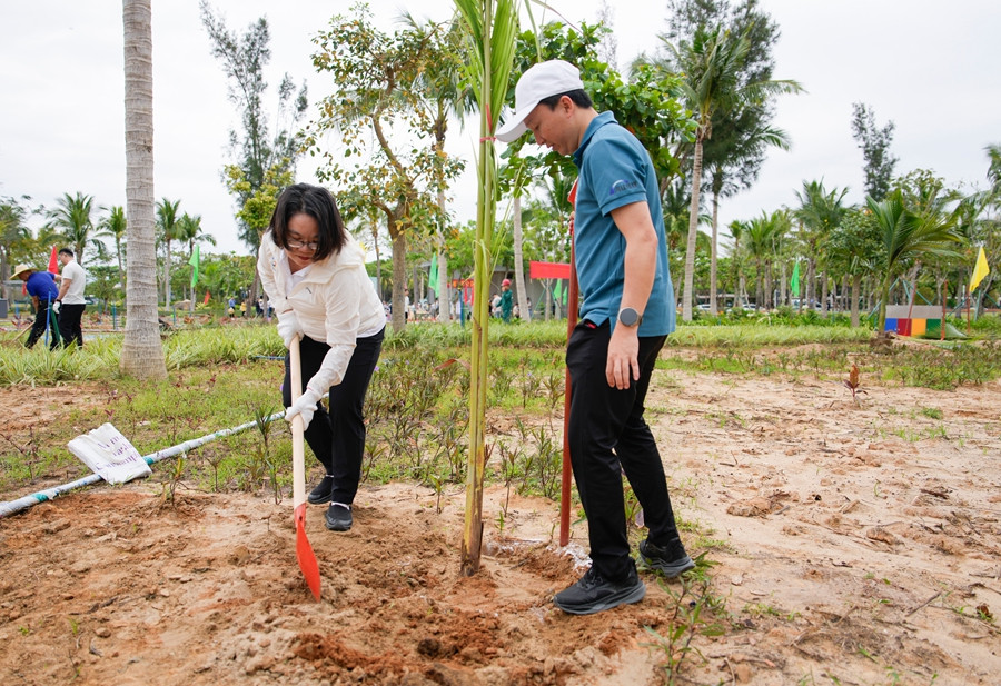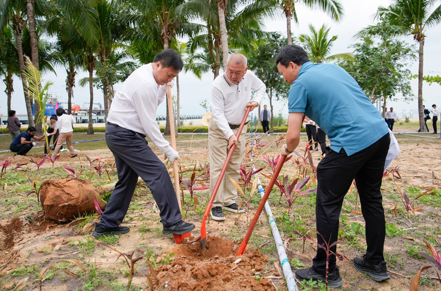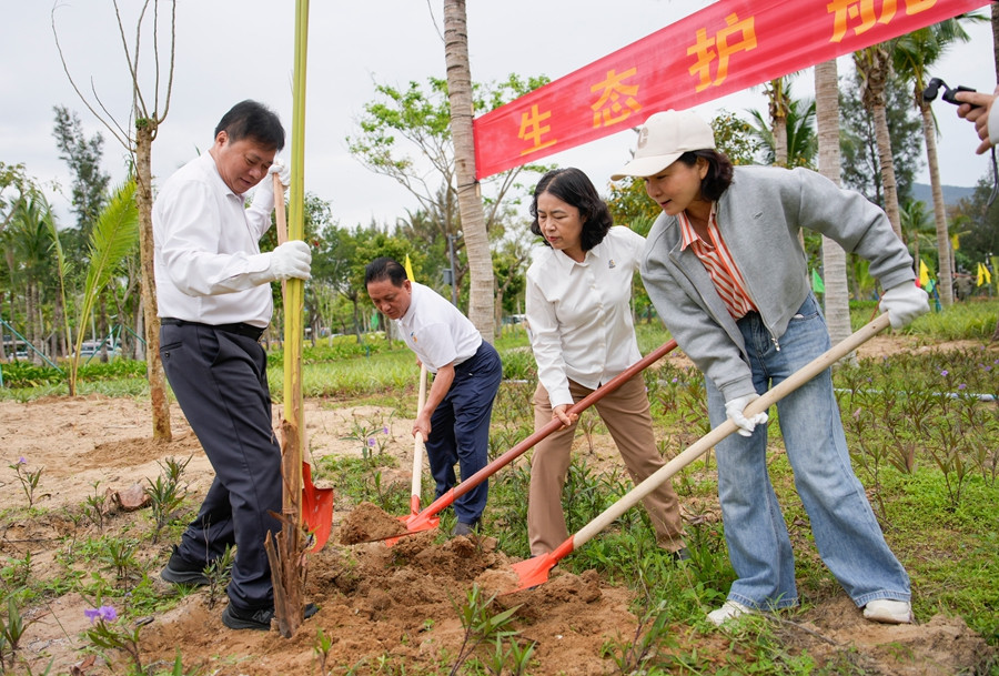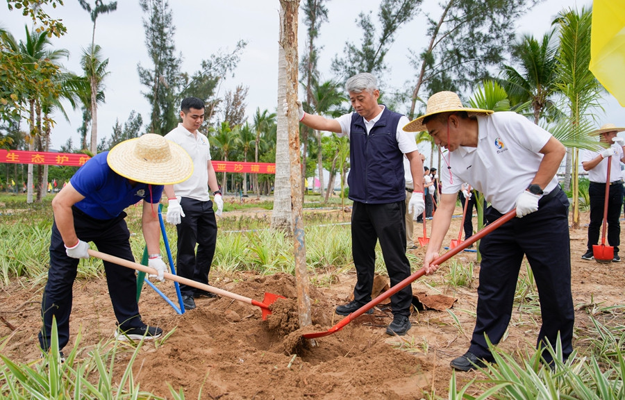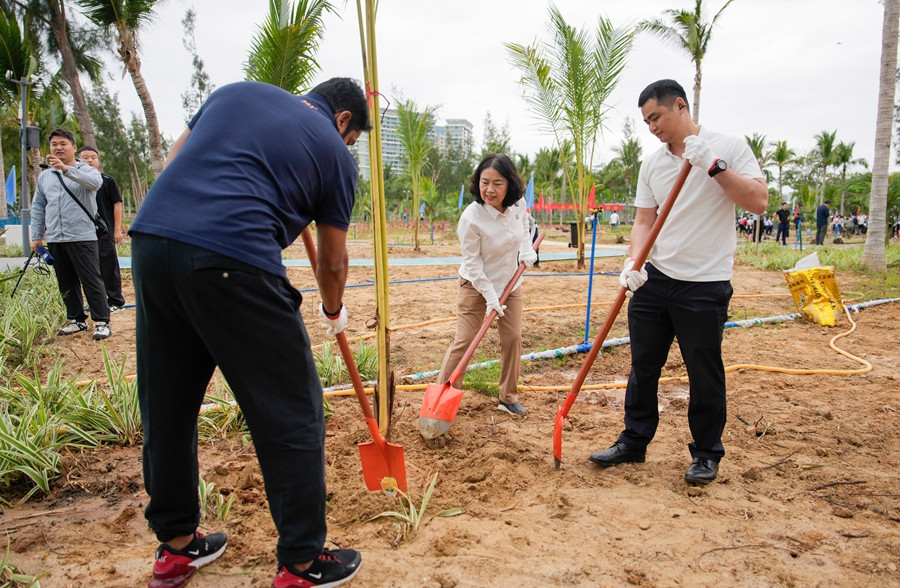 活动现场氛围热烈。大家三两一组、分工协作,扶苗稳根,培土压实,提水浇灌,默契配合,干劲十足。一株株新苗扎根滨海大地,为崖州湾畔增添片片新绿,也为三亚城市生态环境提升添砖加瓦,让赛事筹备与生态保护深度融合、相得益彰。