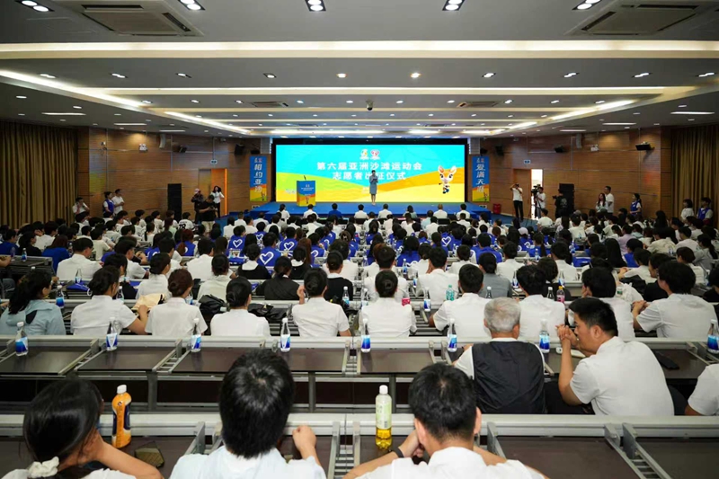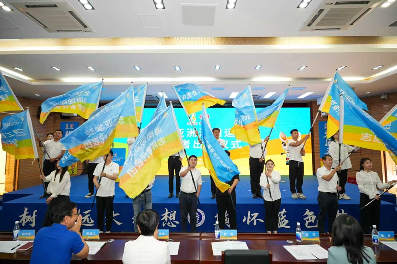 活动现场,16面志愿者团队旗帜被郑重传递。当旗帜在青年手中高高扬起,每一次挥舞,都彰显着责任与担当,也吹响了奔赴赛场的号角。“我宣布,第六届亚洲沙滩运动会志愿者正式出征!”共青团海南省委员会副书记吴昊的一声令下,全场掌声雷动,青春的朝气与奔赴的热血在此刻交融。