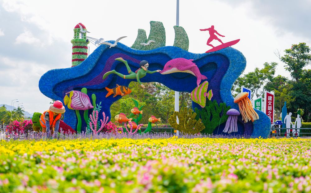 三亚在重要区域、交通枢纽等地,将绿雕、小品、花境以多种形式组合,为广大市民和游客营造浓厚的迎亚沙氛围。