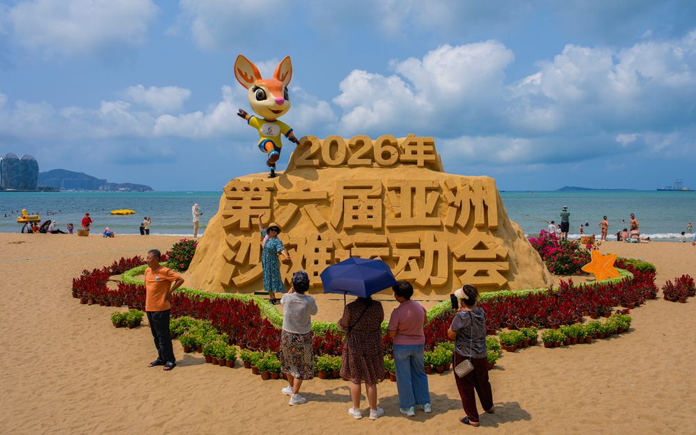 在海月广场一侧的海滩上,一座镌刻着“第六届亚洲沙滩运动会”字样的沙雕格外吸睛,吸引不少市民游客驻足打卡、拍照留念;沙雕周边错落摆放着花卉盆景,花海与沙雕相映,尽显亚沙氛围与滨海风情。游客王女士说,“这么有特色的亚沙沙雕,还有繁华相伴,氛围感十足,祝愿三亚亚沙会圆满成功!”
