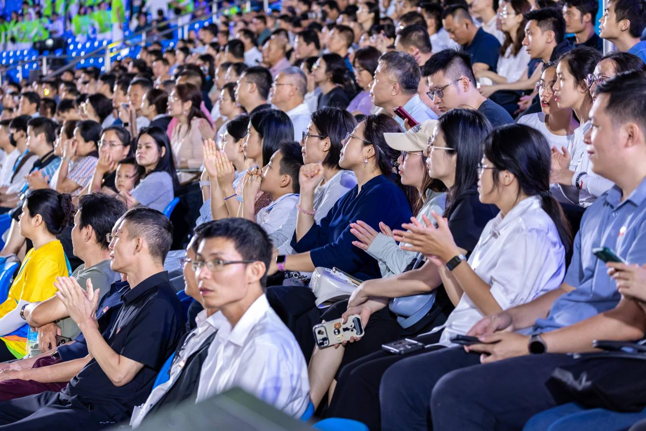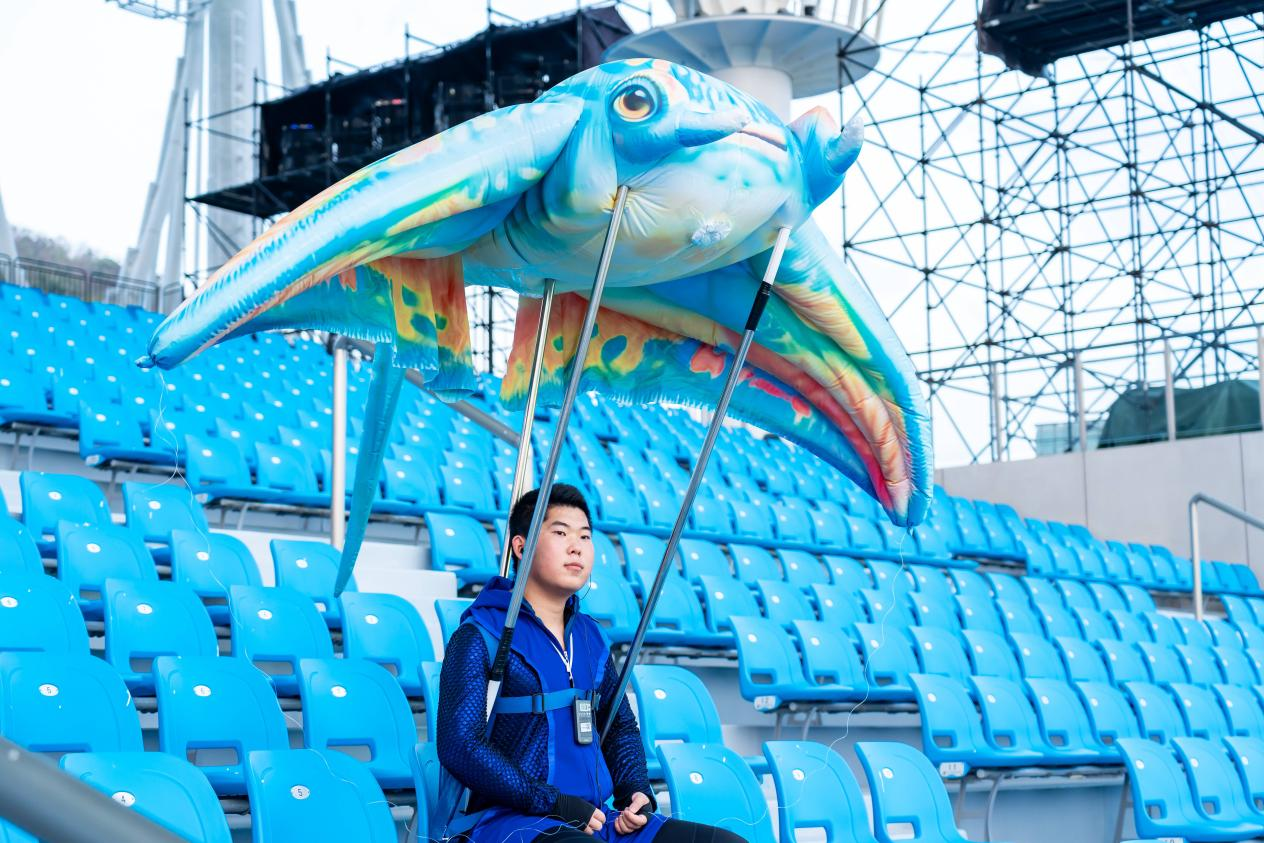 在“深海逐梦”篇章中,一场别开生面的海洋奇观令现场观众惊喜不已。儒艮、鲸鲨、海龟、水母等形态各异的海洋生物从观众席间和两侧威压塔边缓缓“游”向主舞台,它们或在高空轻盈飞舞,或在坐席区与观众亲密互动,亲亲脸颊、摸摸头等。这些灵动的海洋生物打破了舞台与观众席的界限,让观众仿佛沉浸于深海之中。总导演章东新表示:“我们希望通过这种沉浸式的互动设计,让每一位观众都成为演出的一部分。人与海洋生物零距离接触,传递的正是‘人与自然和谐共生’的理念”