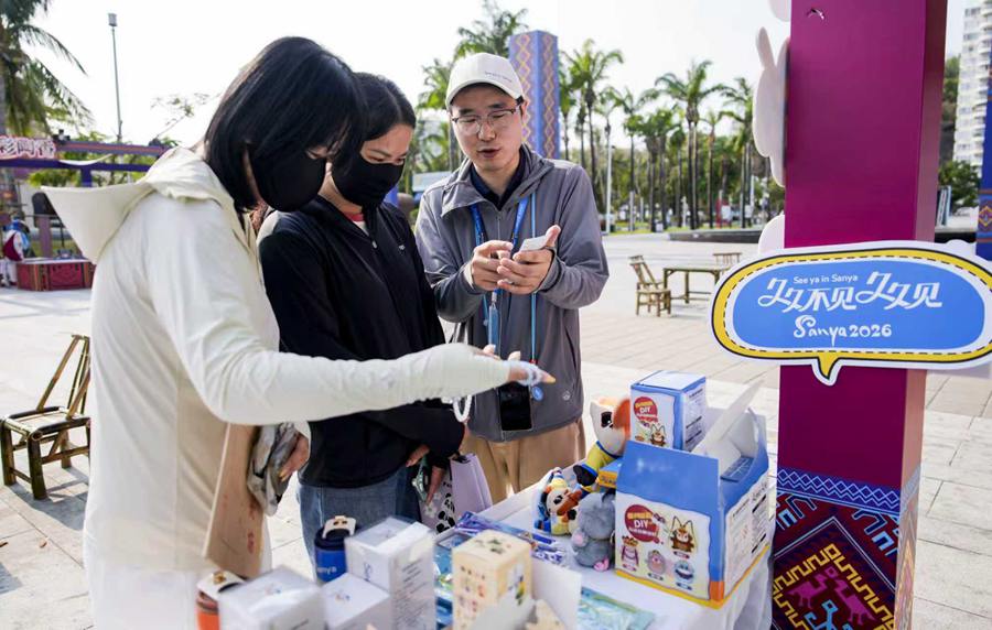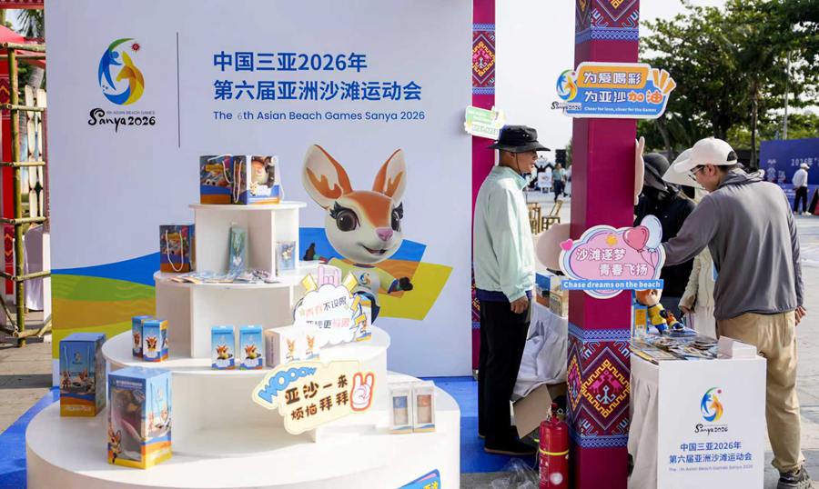 展位上,保温杯、笔记本、特色手链等十余种设计精巧的亚沙文创产品琳琅满目,引得大家纷纷驻足观赏、挑选购买。其中,高端典藏款“一鹿摘金”贵金属版画,以三亚标志性的“鹿”为核心设计灵感,巧妙融入黎苗传统纹样,尽显非遗的深厚底蕴;亚沙会纪念邮册精心甄选海南自贸港纪念邮票、热带自然风光及黎族苗族文化主题邮品,兼具极高的收藏价值与丰富的文化内涵。亚沙会会徽“扬帆”、吉祥物“亚亚”等时尚潮流元素,与黎锦纹样、苗银装饰等非遗符号完美交融,传统民族文化的厚重积淀与沙滩运动的青春活力相辅相成,市民游客在沉浸式领略非遗之美的同时,也提前感受到亚沙会热烈浓郁的氛围与时尚动感的魅力。
