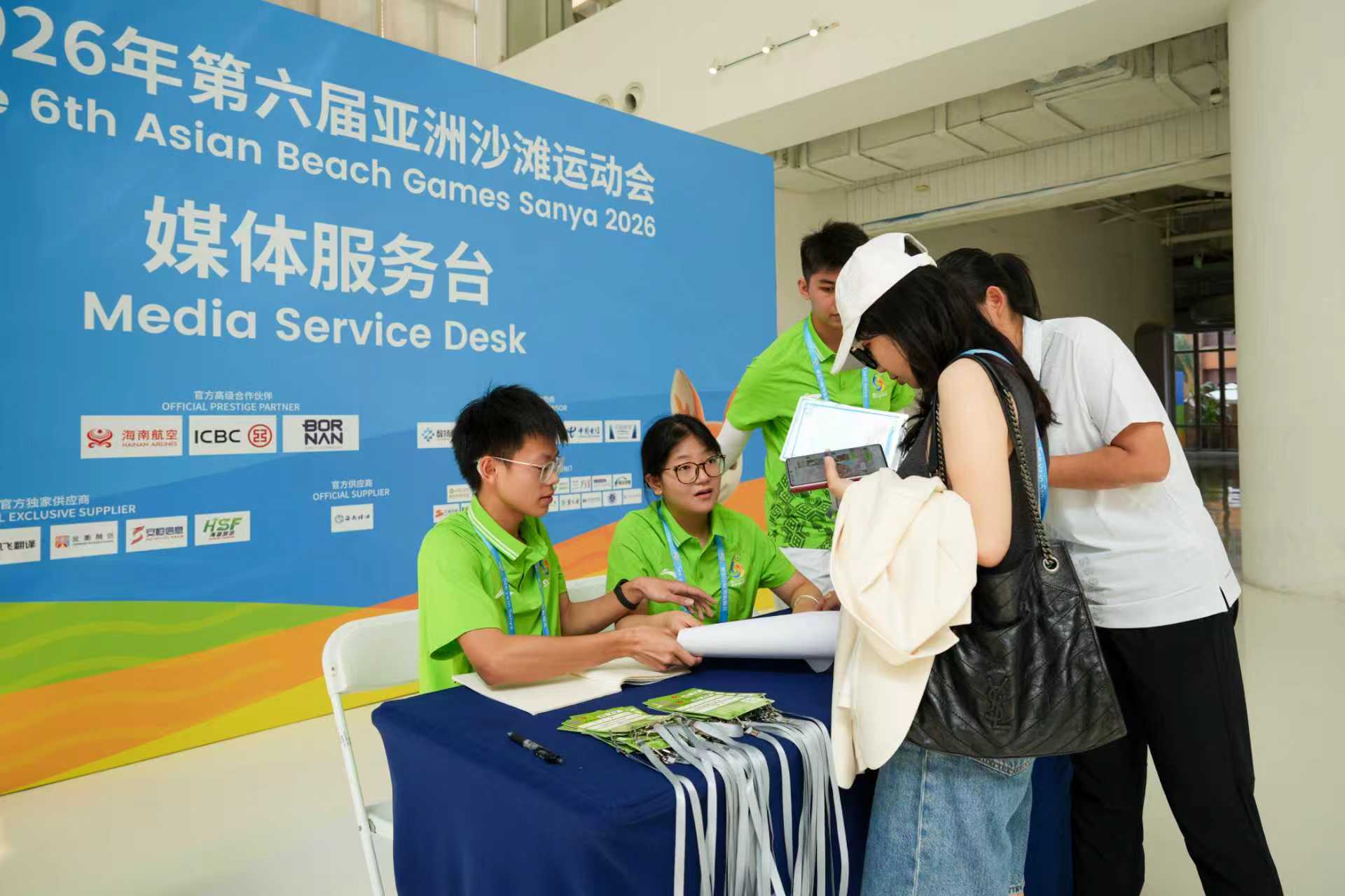 三亚亚沙会运动员村媒体服务台前,志愿者正在为到访媒体办理证件。