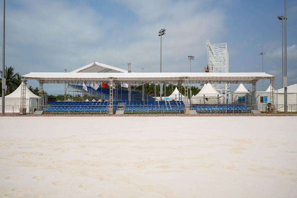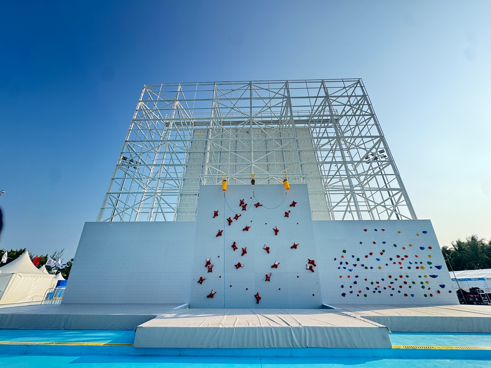 其中,沙滩排球设男子、女子两个小项,配有5片比赛场地与2片训练场地;攀岩项目包含男子、女子速度赛,下设个人标准速度赛和速度接力赛,共4个小项;沙滩手球同样设有男、女两个小项,配备2片比赛场地和2片训练场地。攀岩场地则设有1片比赛场地与1片训练场地,满足赛事与训练双重需求。