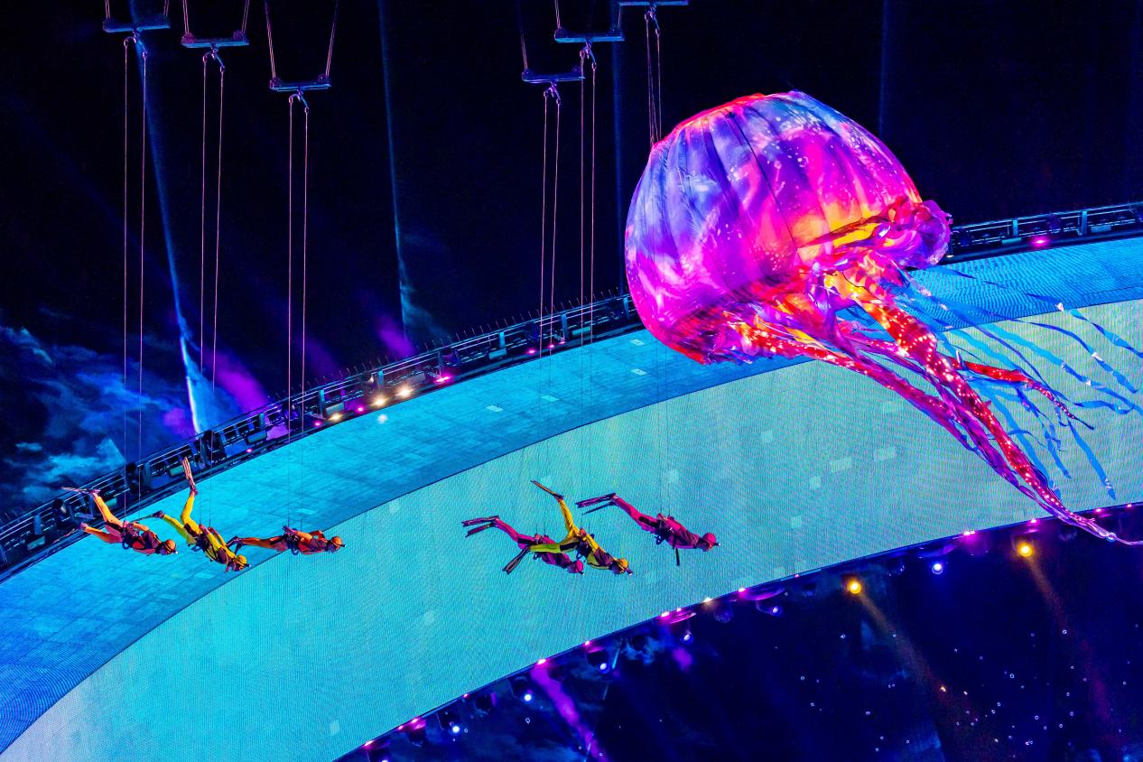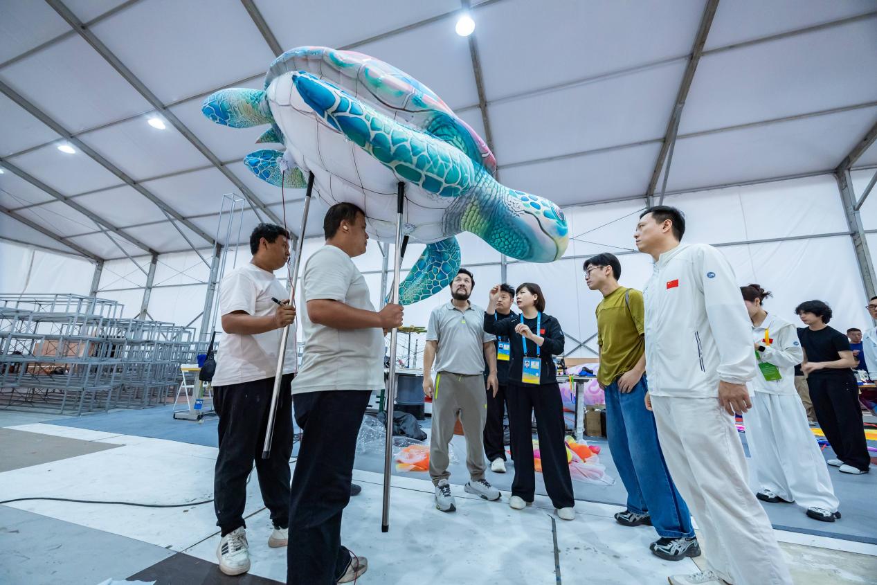 道具总设计古英棠剧透,中篇《深海逐梦》中,两只大型充气水母将从高空“游”向主舞台,地面及观众席则有儒艮、海龟等14只充气海洋生物穿梭互动。下篇《联通四海》里,8组空中威亚装置通过矩阵组合,呈现大型吊臂、拱形大桥与深海钻井平台,寓意拔地而起的“梦想巅峰”。执行总导演唐巍峰坦言,威亚演出志愿者每日排练长达6小时,将常规两三个月的排练压缩至十余天。