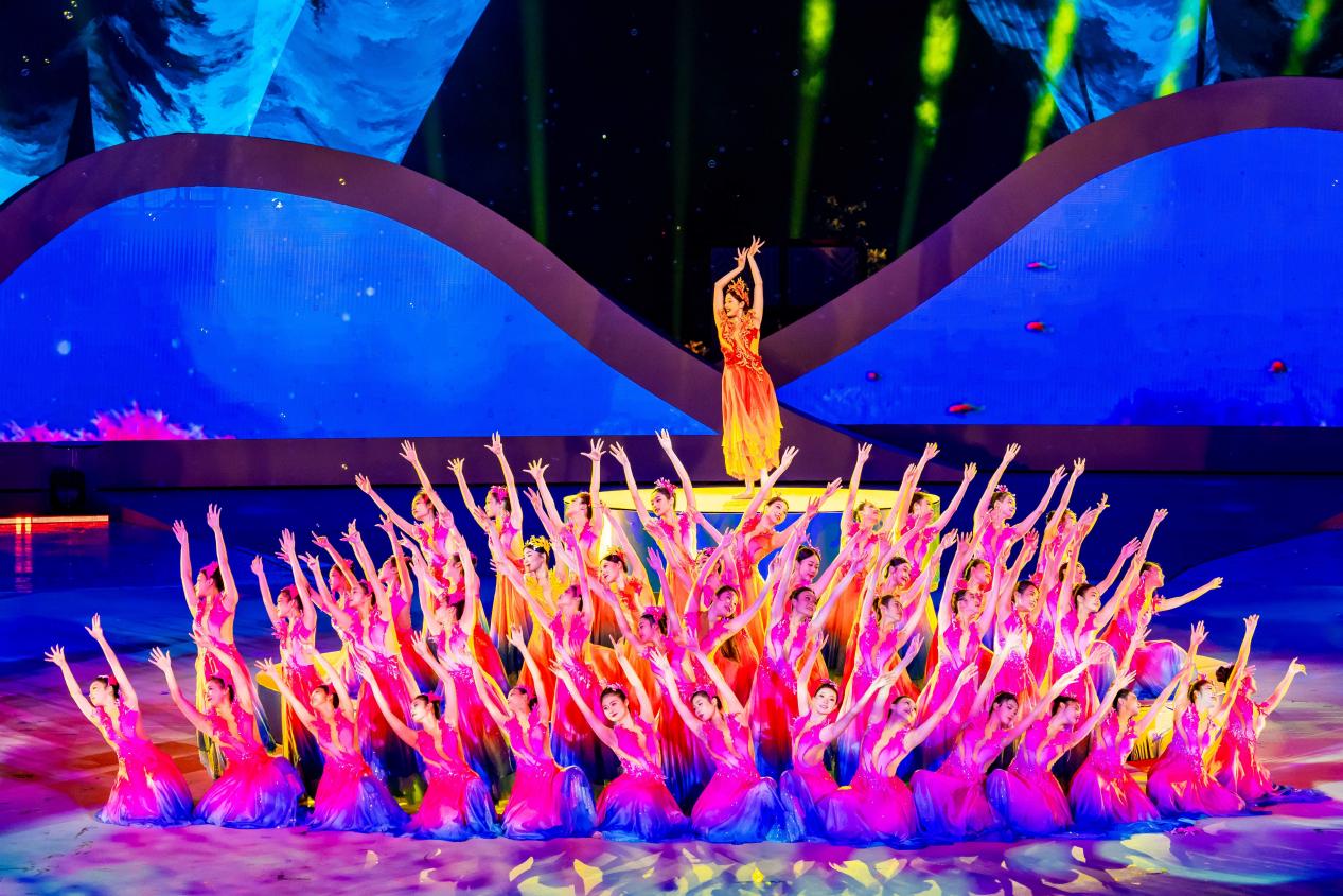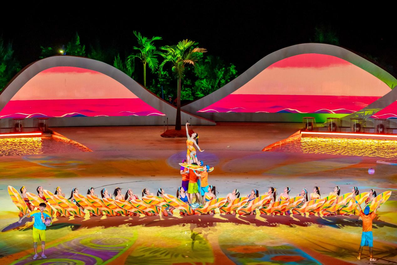 18分钟的文艺表演,浓缩了海洋文化与海南自贸港开放精神。制作总监魏来表示,团队利用高空威亚与地面影像联动,呈现“高中低、前中后”的全景视觉。