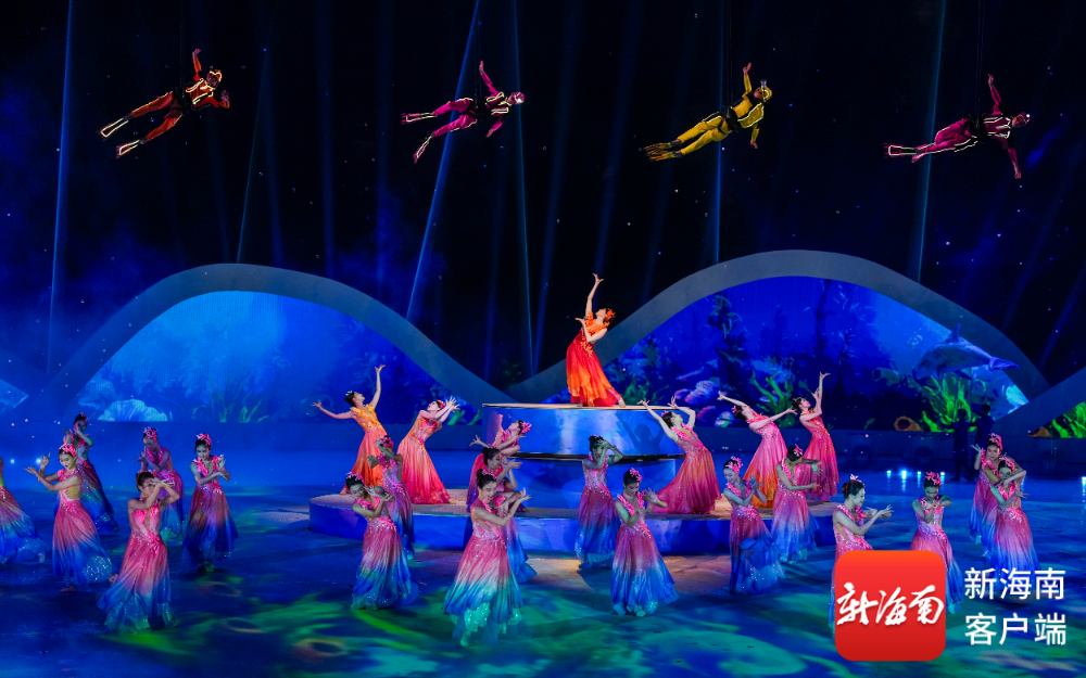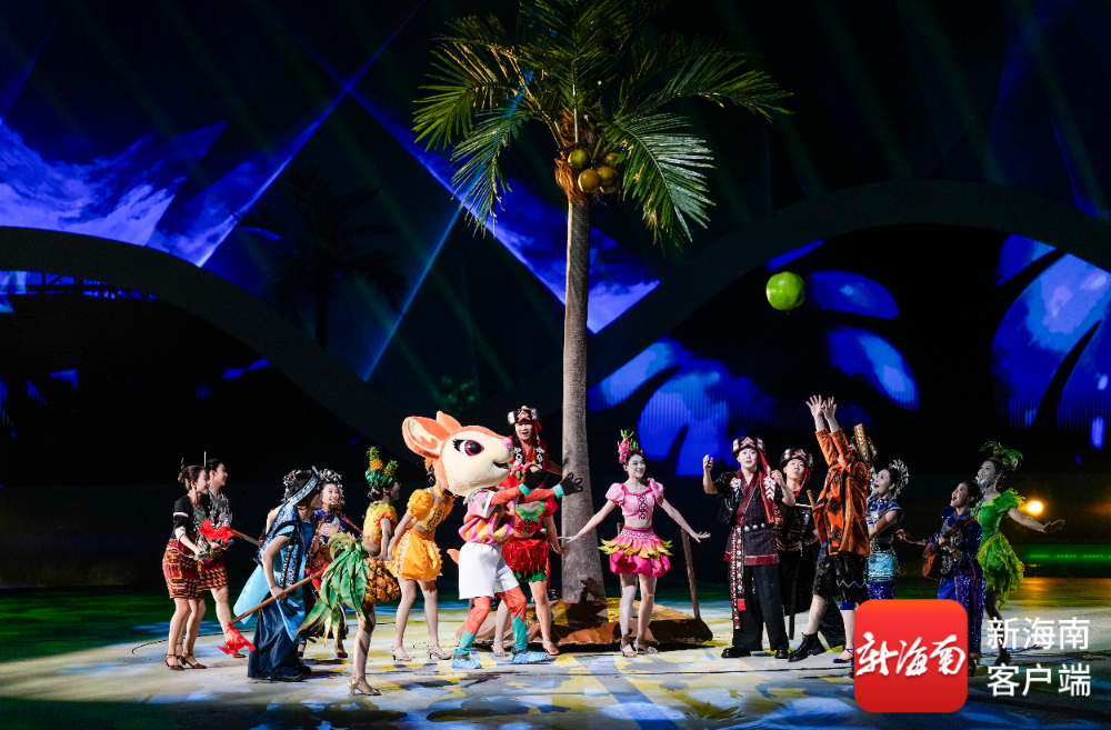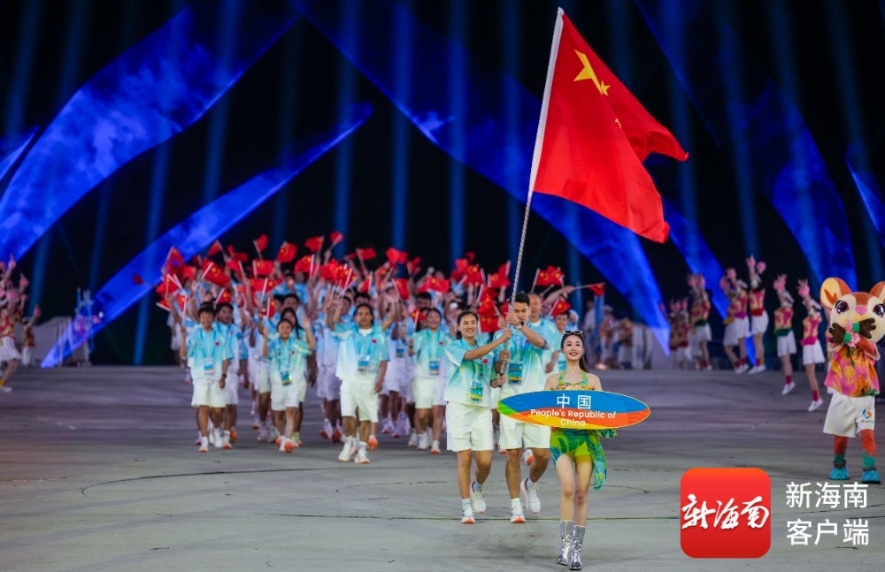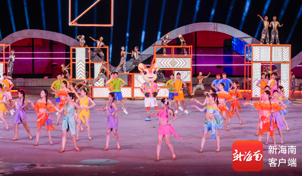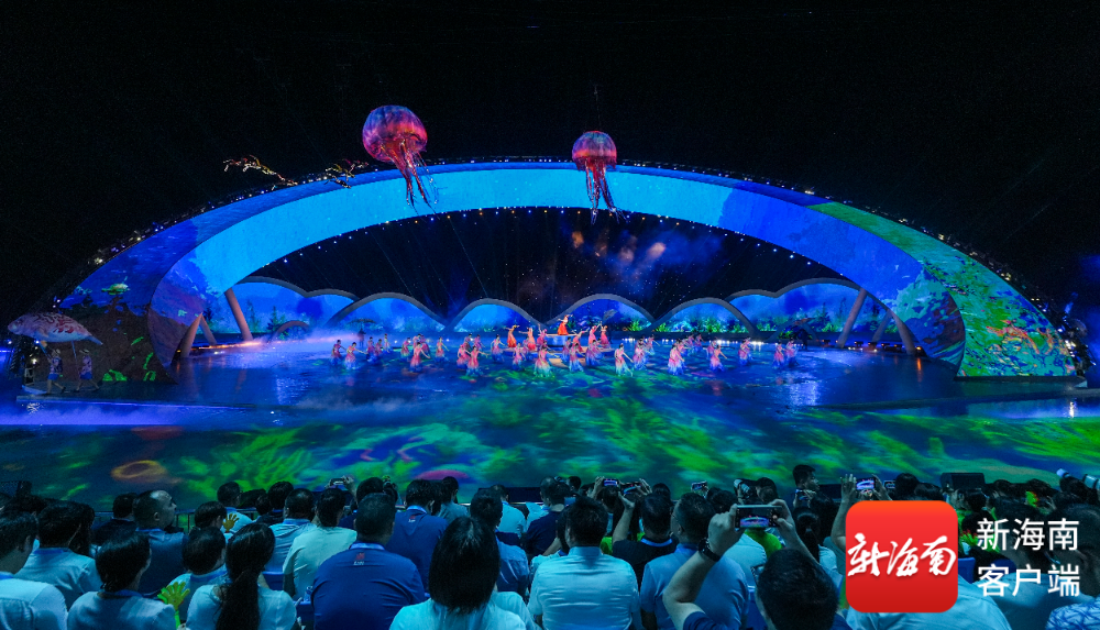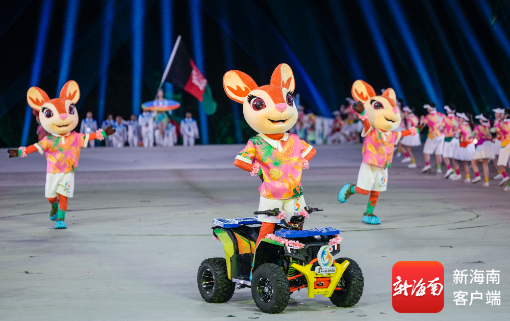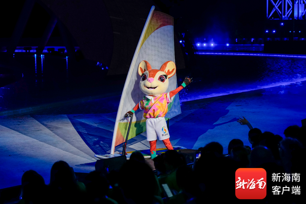 开幕式上,吉祥物“亚亚”骑沙滩摩托登场,以喜剧化叙事串联黎族苗族民俗与现代三亚风情;《深海逐梦》篇章中,巨型水母威亚装置凌空浮游,潜水员与珊瑚“亲吻”,传递人与自然共生理念;《联通四海》则以空中钢架矩阵结合焰火,展现自贸港建设的磅礴力量。运动员踏着“天海大道”入场,海浪造型装置随节奏舒展,营造“客从海上来”的诗意氛围。