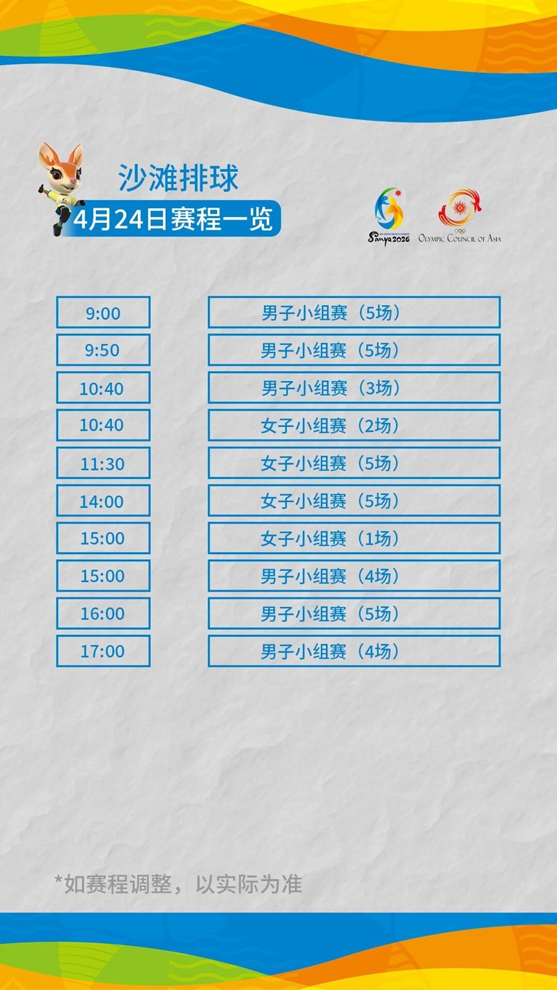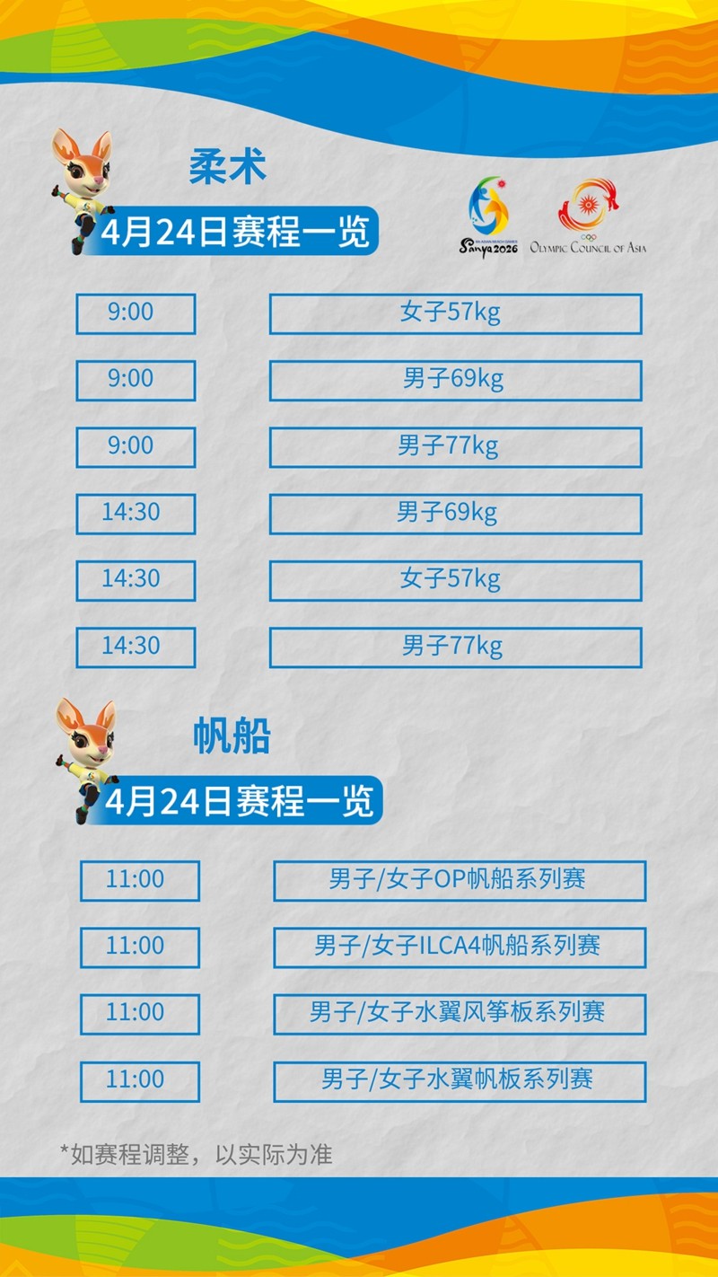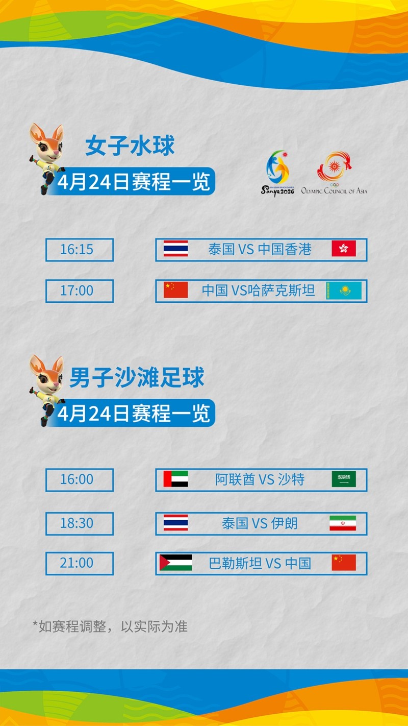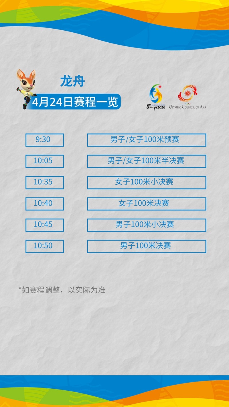 4月24日水球、沙滩田径、龙舟、柔术等项目将产生共10枚金牌。