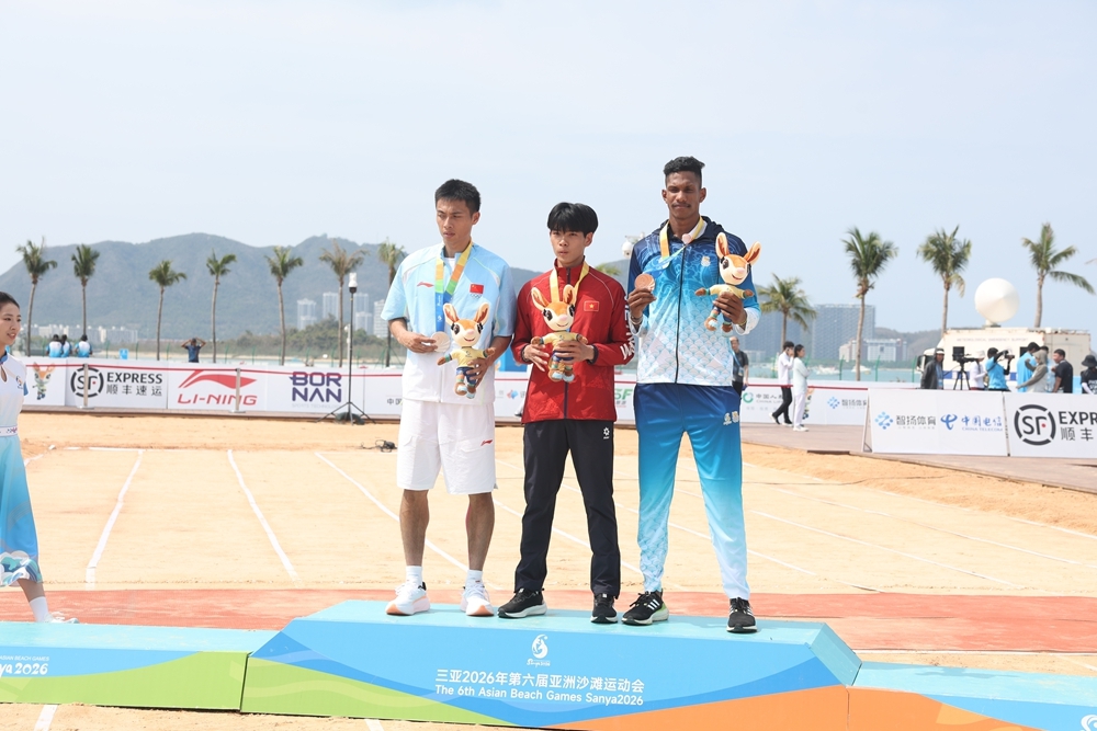 中国选手陶叶革(左)获得第六届亚沙会沙滩田径男子跳远银牌。海报集团全媒体记者韦茂金 摄