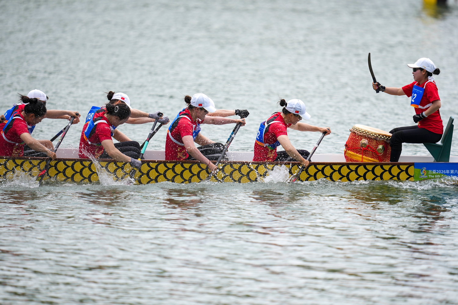 4月25日,第六届亚洲沙滩运动会龙舟比赛200米直道竞速比赛在三亚河激情开赛。