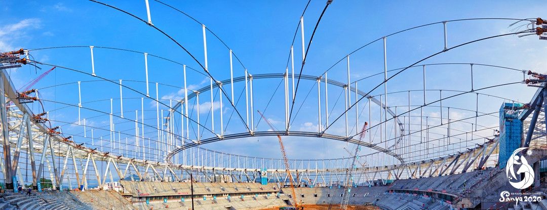 图为三亚国际体育产业园体育场项目索结构张拉提升工程施工全部完成。封烁摄