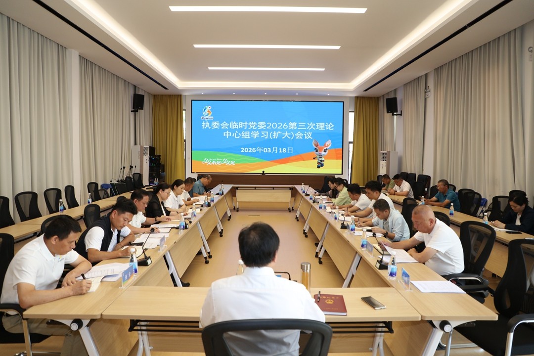 3月18日上午,第六届亚洲沙滩运动会(以下简称:三亚亚沙会)执行工作委员会临时党委召开2026年第三次理论中心组学习(扩大)会议,集中传达学习全国两会精神。会议由临时党委书记张长丰主持,全体党委委员及各党支部支委委员参加会议。