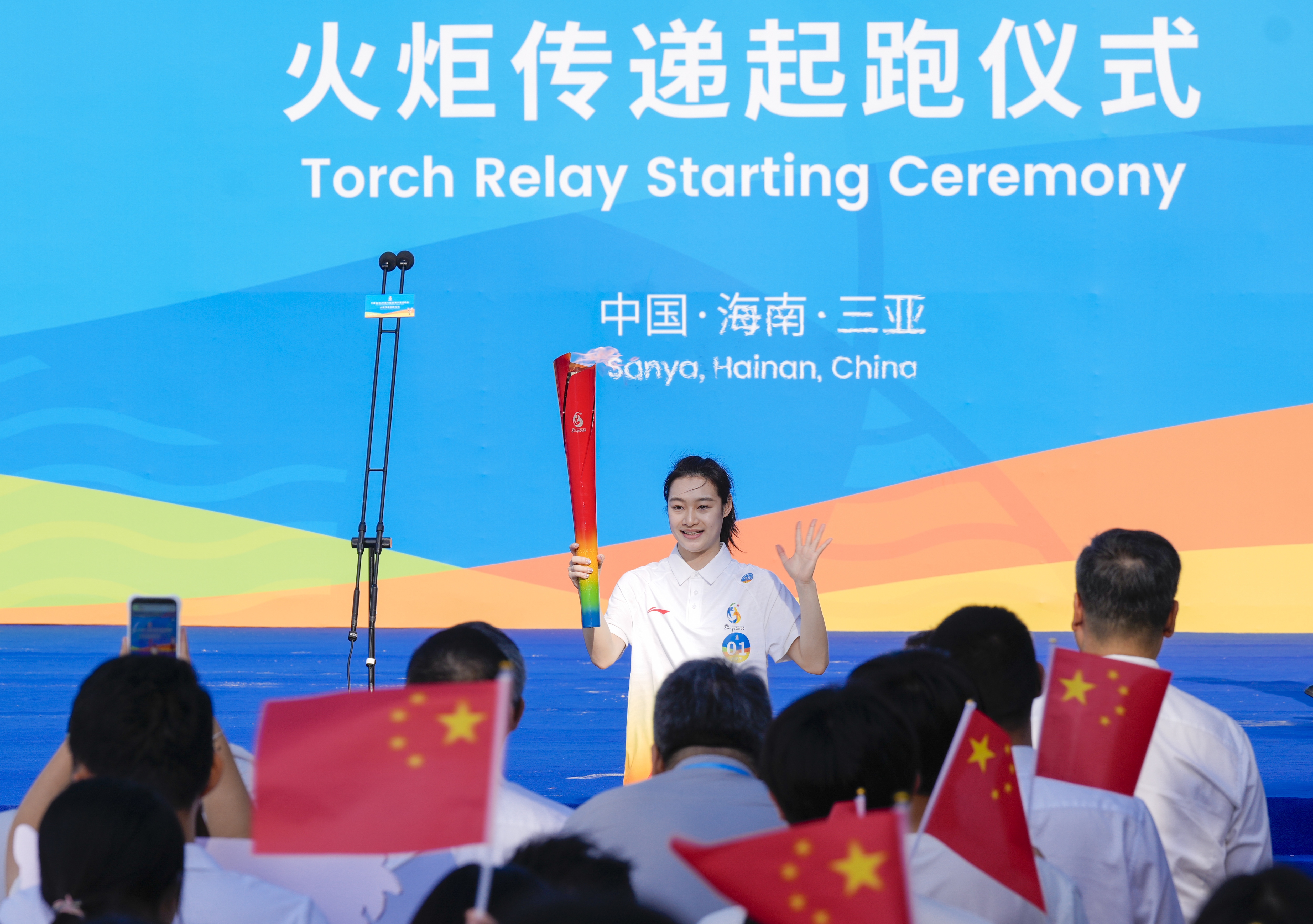 3月30日,第六届亚洲沙滩运动会火炬传递活动在三亚举行。图为火炬传递起跑仪式现场的展国旗和迎亚奥理事会会旗环节。