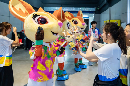 台上热情,台下更欢腾。排练间隙,“亚亚”在后台和演出志愿者击掌、拥抱、自拍。仪式总导演王立媛说,“亚亚”从不“出戏”,只要穿着人偶服,就一直笑、一直蹦。“它不只是一个卡通形象,更像是我们中间的开心果。”