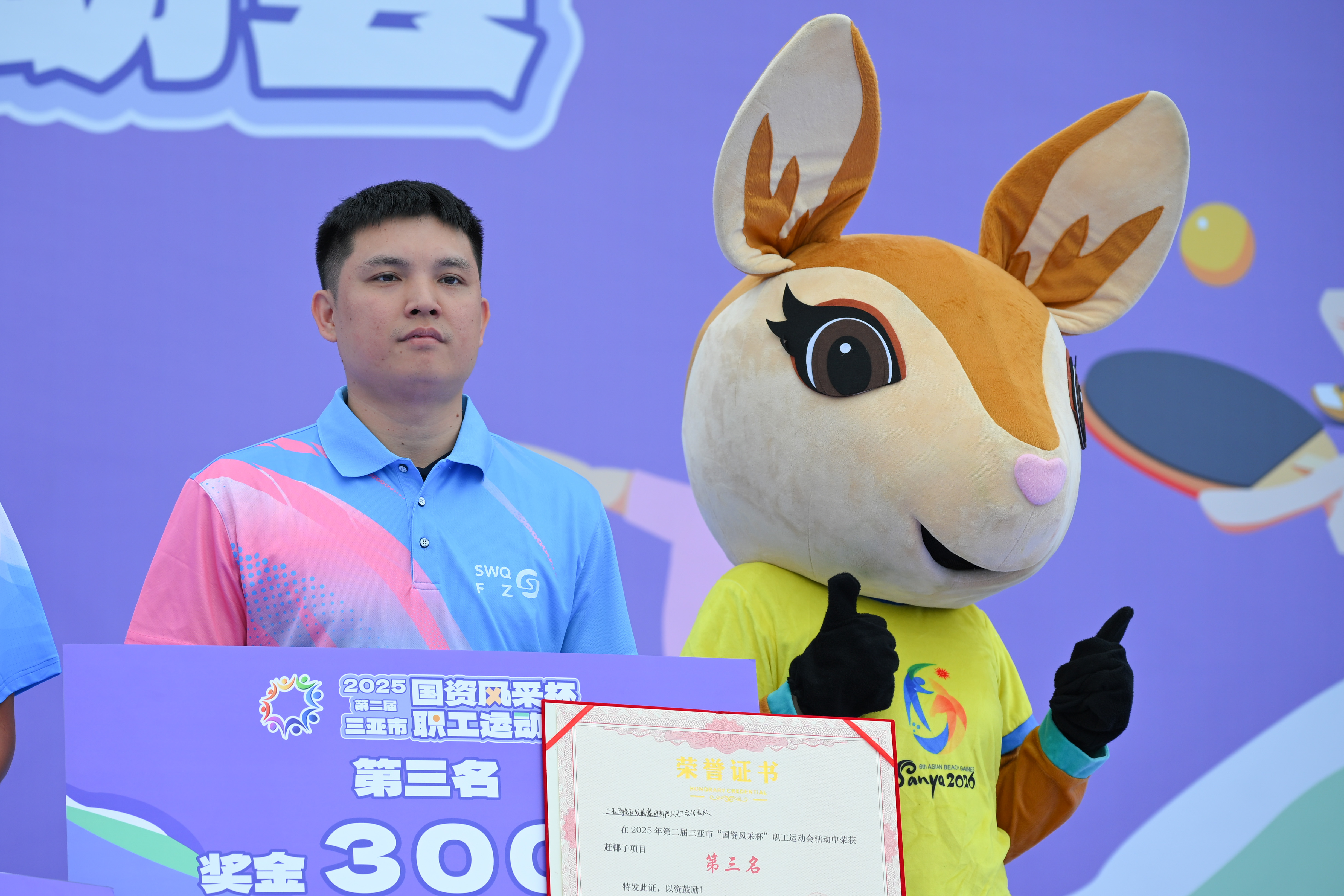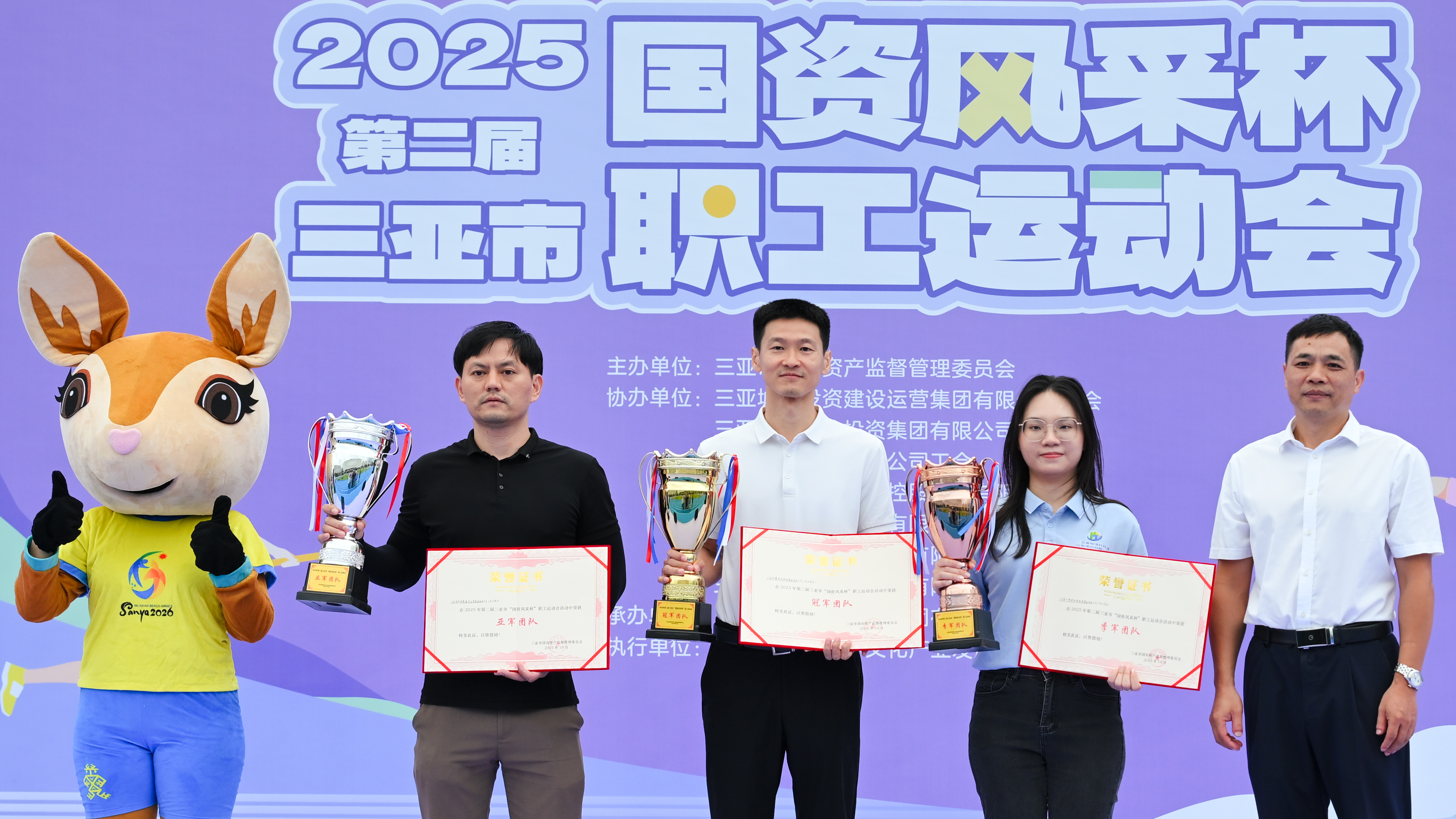 谁说职场人只会开会加班?看三亚国企天团如何“玩”出体育新高度!10月21日,2025 年第二届三亚市 “国资风采杯” 职工运动会在三亚市体育中心欢乐收官。当2026年第六届亚洲沙滩运动会(以下简称:三亚亚沙会)吉祥物“亚亚”现身,瞬间点燃全场。