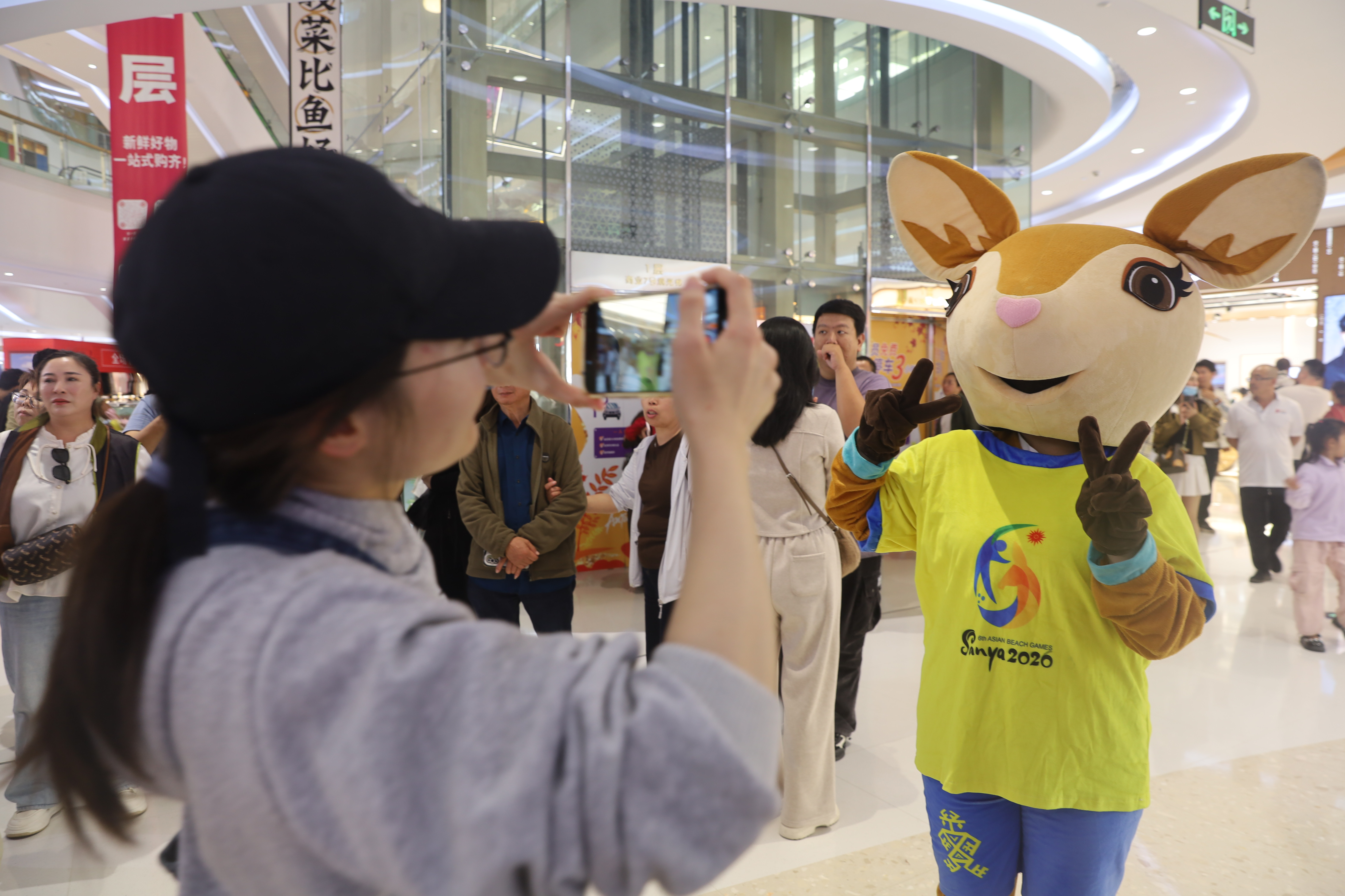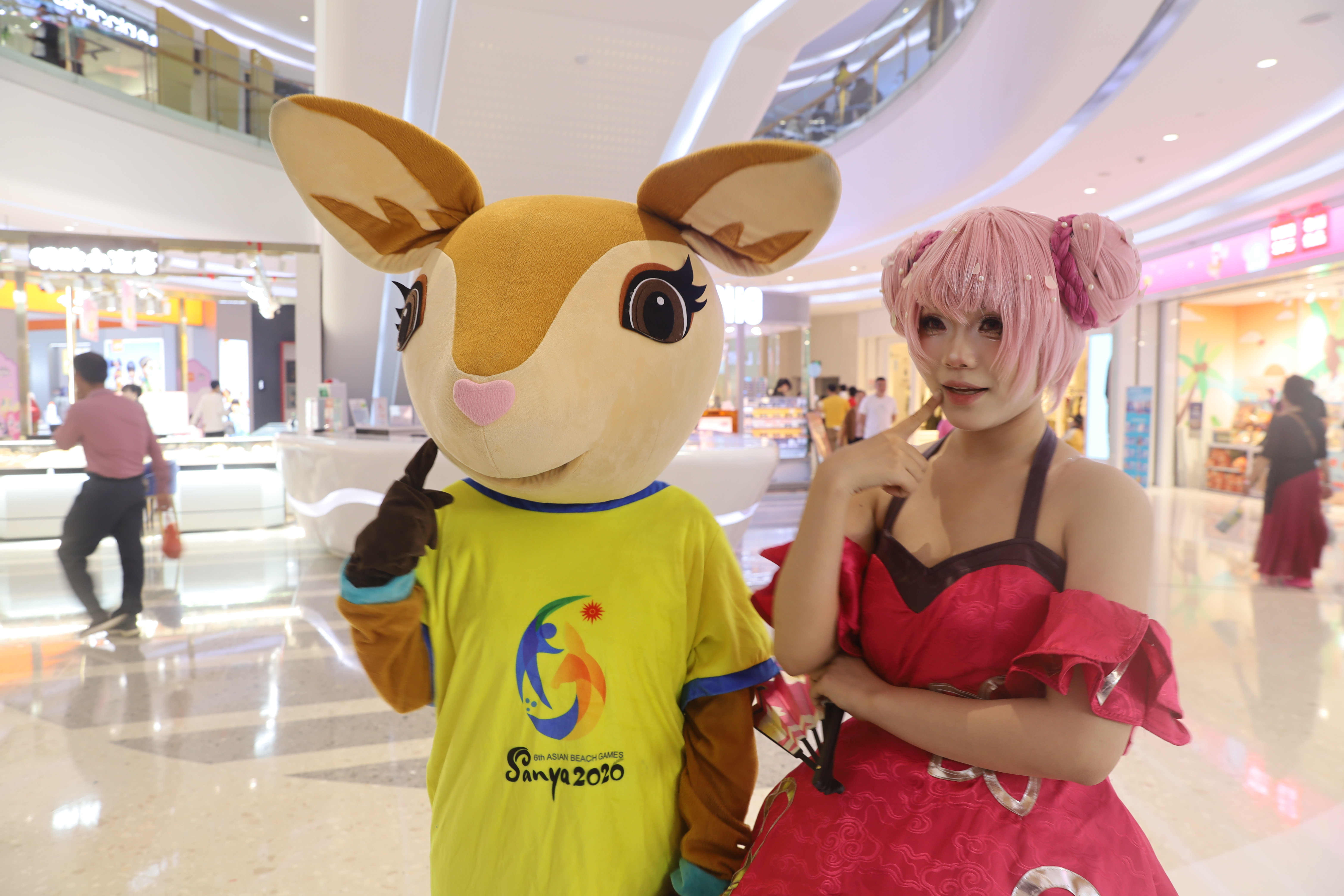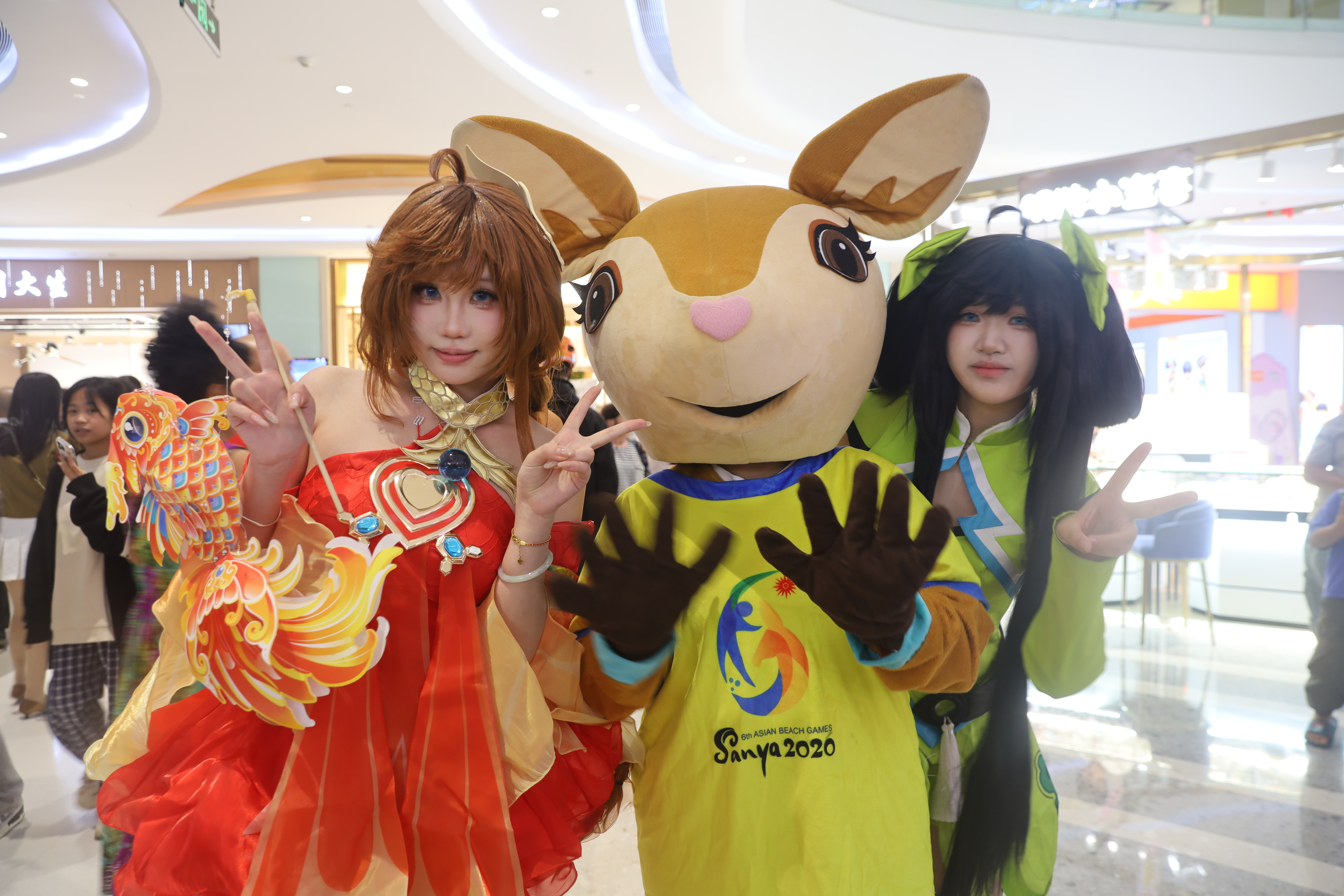 1月1日晚,电竞嘉年华Coser巡游活动在三亚蓝海购物广场举行。第六届亚洲沙滩运动会吉祥物“亚亚”与现场群众合影留念。