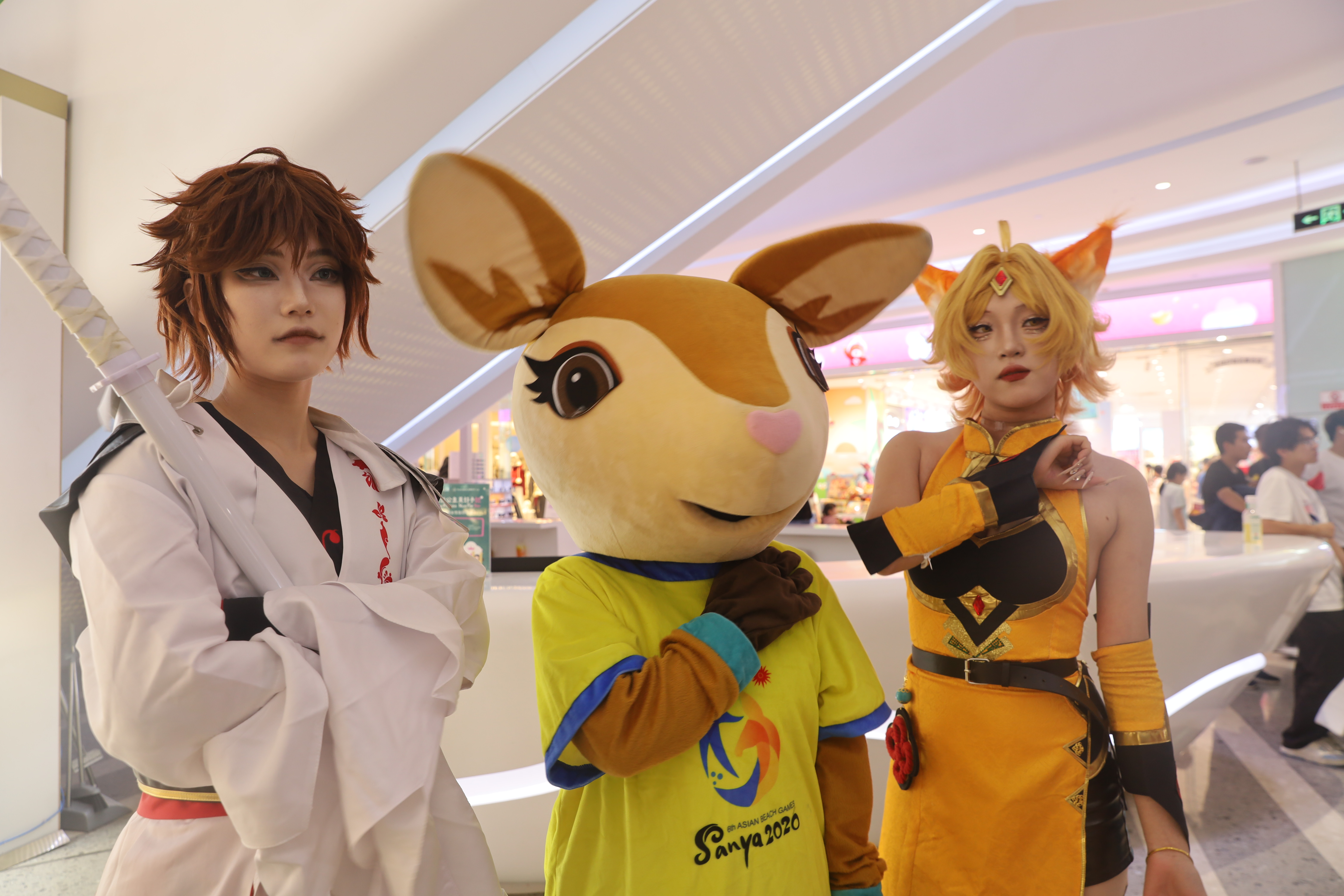 1月1日晚,电竞嘉年华Coser巡游活动在三亚蓝海购物广场举行。第六届亚洲沙滩运动会吉祥物“亚亚”与Coser互动合影。