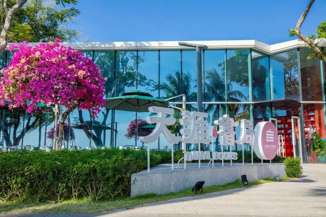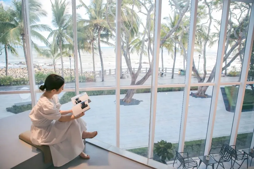 书局隐于碧海蓝天之间,红色书架沿着海岸线蜿蜒伸展,像一艘静泊的船,载着千年墨香与南海的浪花轻轻摇晃。书局里点上一杯咖啡,在阅读里感受山海浪漫。
