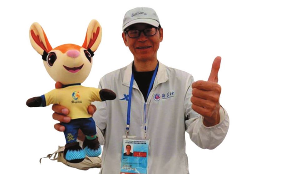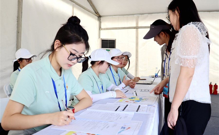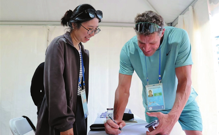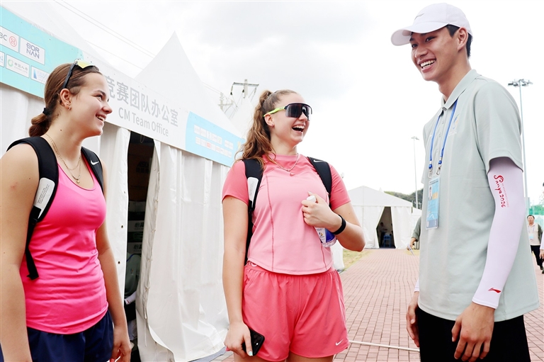 一名志愿者为外籍运动员提供志愿服务。王昊 摄