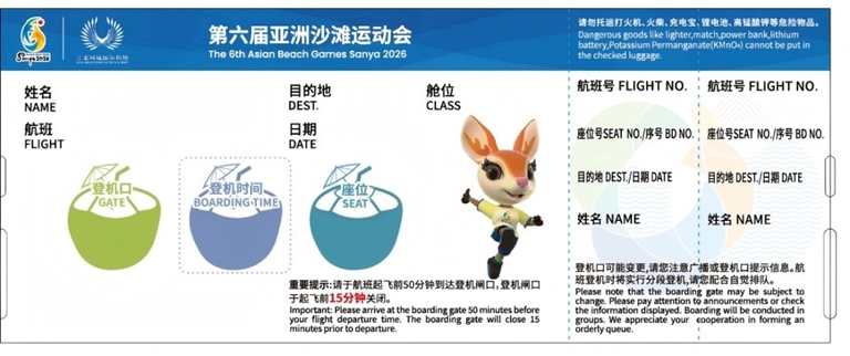 在设计上,登机牌紧扣三亚亚沙会主视觉,推出“海洋蓝”与“热情红”两款色调。登机牌正面设计以吉祥物“亚亚”为核心,辅以清新的椰子图案,生动展现了三亚热带滨海城市的独特风情;背面则呈现吉祥物“亚亚”的运动造型,并结合三亚亚沙会宣传口号,勾勒出一幅阳光、沙滩、海浪与运动交织的活力画卷。登机牌左上角醒目印制三亚亚沙会会徽与机场标识,强化了赛事专属识别度。