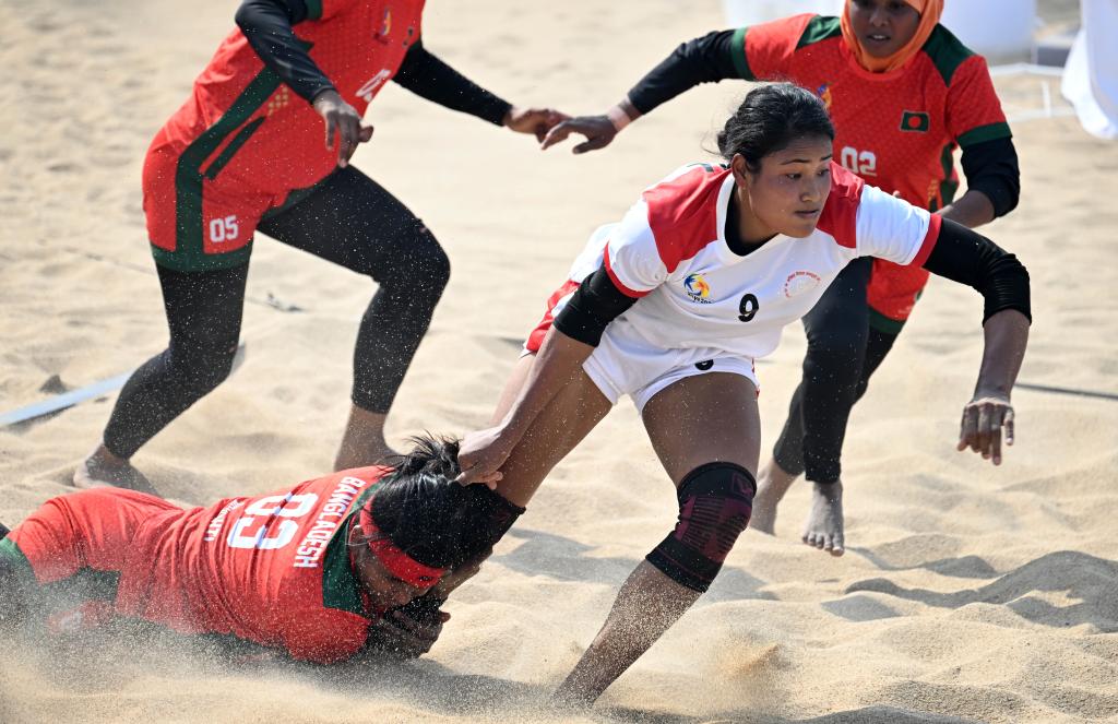 4月26日,孟加拉国队选手布里什蒂·比斯瓦斯(左下)和尼泊尔队选手拉比娜·乔杜里(右)在比赛中。当日,在海南三亚举行的第六届亚洲沙滩运动会沙滩卡巴迪女子小组赛中,尼泊尔队38:36战胜孟加拉国队。新华社记者 赵子硕 摄