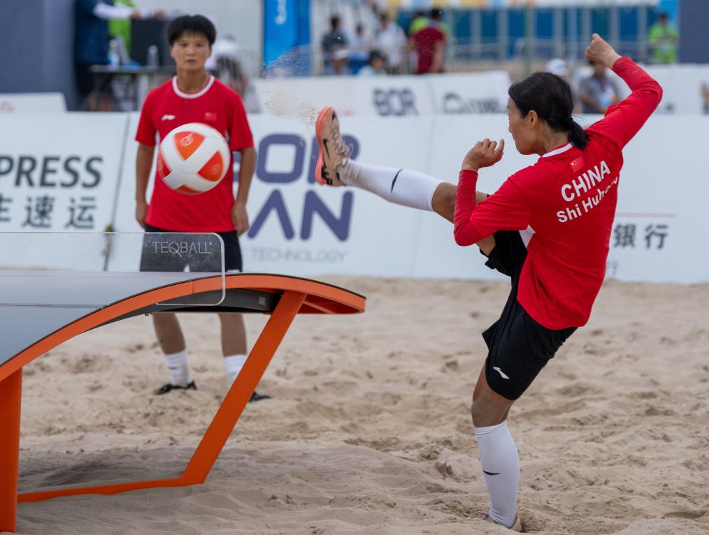沙地上,一张张弧形球桌格外醒目。中国队选手石胡红、崔亚珍身体微弓,紧盯来球,在攻防转换间完成“绝杀”与救球,引得观众阵阵惊呼。