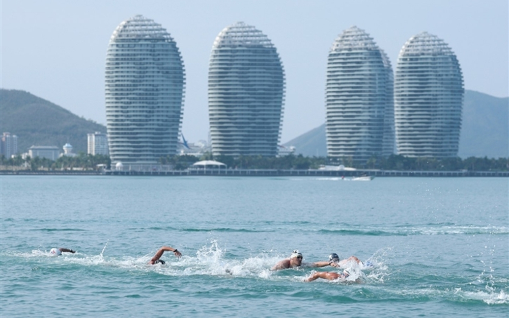 4月26日,选手们在公开水域游泳男子5公里比赛中。新华社发(马子涵摄)