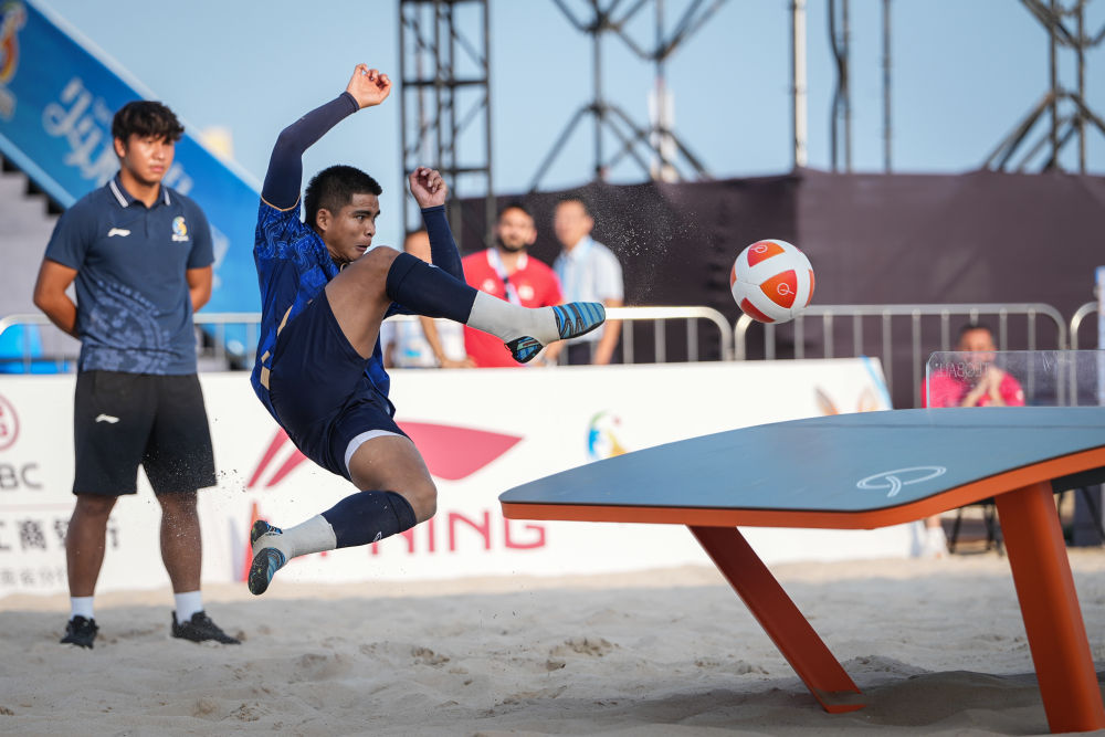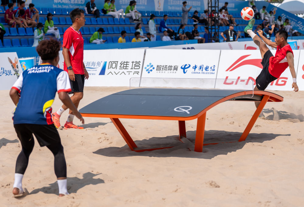 新华社三亚4月26日电(记者季嘉东、肖世尧、贺书琛)在三亚亚沙会的赛场上,有一项运动看得人眼花缭乱——球员们用脚弓轻巧垫球,再用头球精准调整,完成一记漂亮的正脚背凌空扣杀。这不是足球,而是台克球——一项把足球技巧、乒乓球器材“揉”在一起的运动,首次成为亚沙会正式比赛项目。