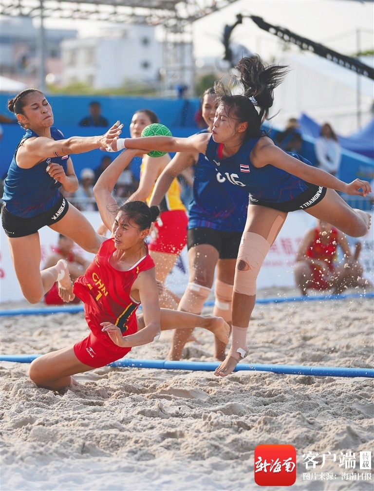 三亚亚沙会女子沙滩手球半决赛,中国队(红色)突破泰国队防守射门。海报集团全媒体中心记者 王程龙 摄