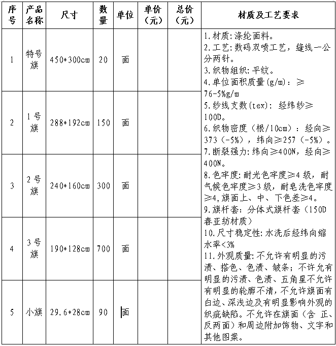 为保障第六届亚洲沙滩运动会旗帜的规范使用及悬挂符合要求,塑造赛会专业、严谨、友好的国际形象,执委会根据《第六届亚洲沙滩运动会执行工作委员会采购管理规定》第七条第二项“执委会自行采购”之规定进行采购工作,欢迎符合资格条件的供应商前来报价。